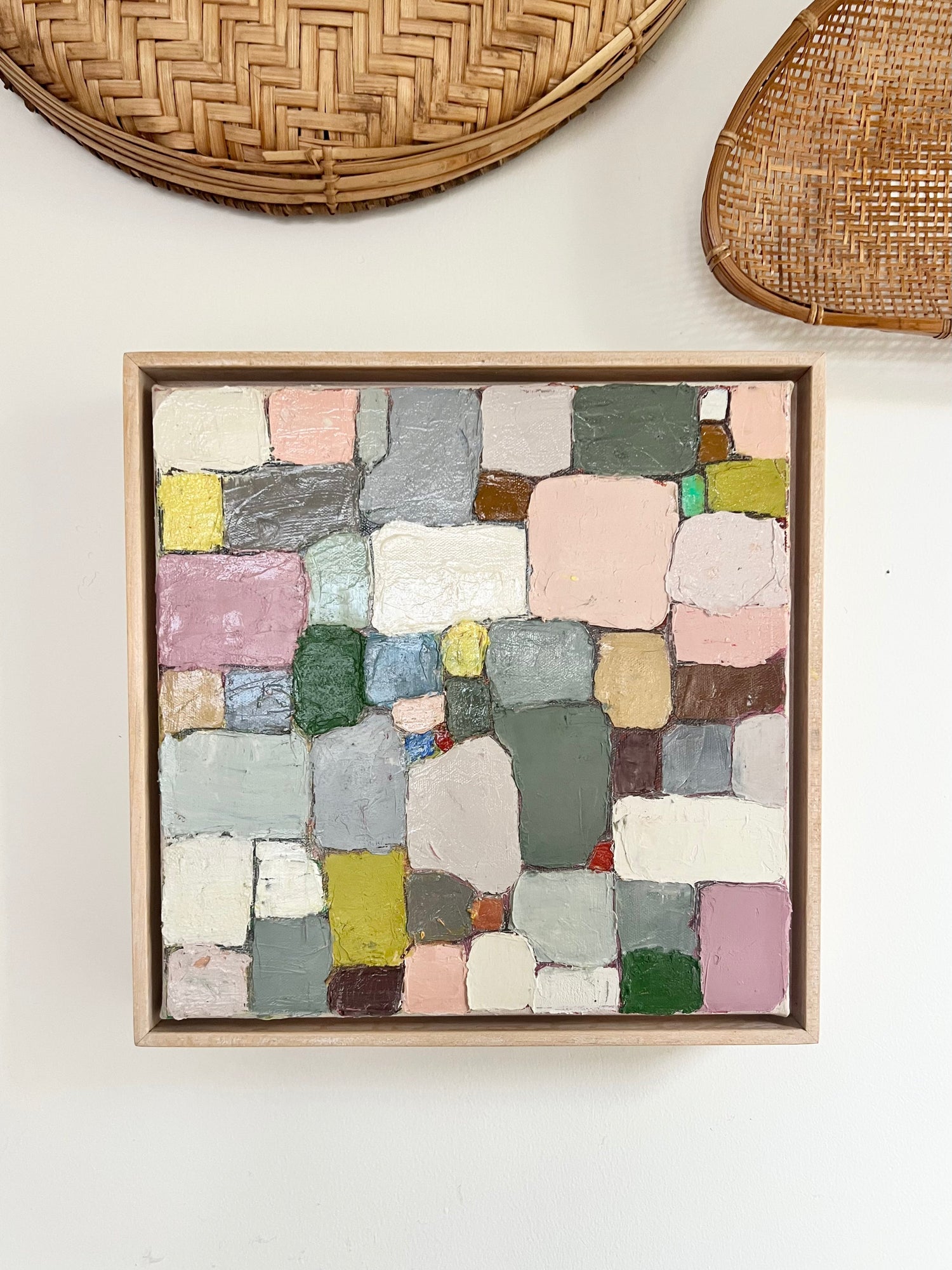 These pieces are framed in natural finshed maple floater frames around gallery wrap...
