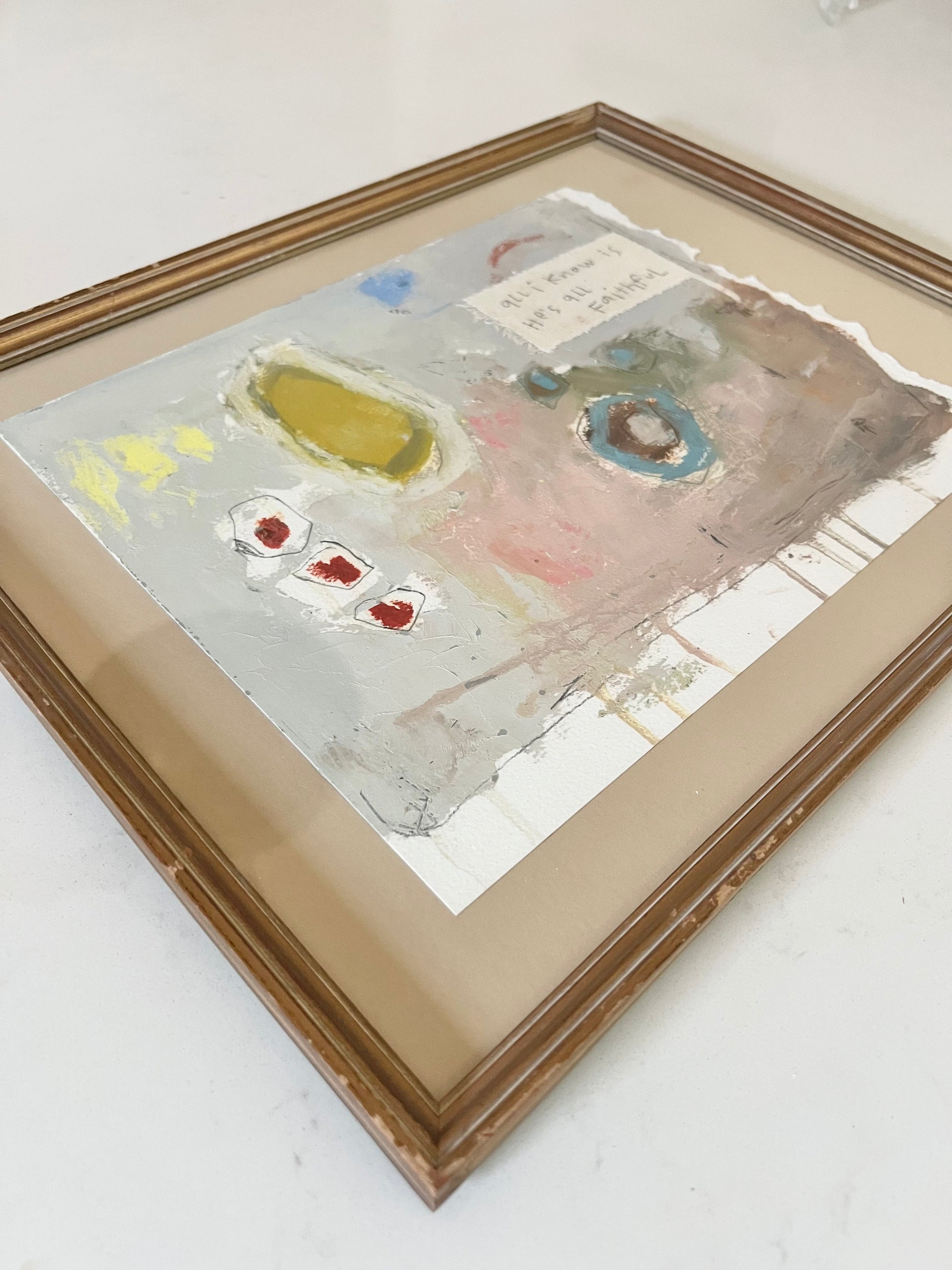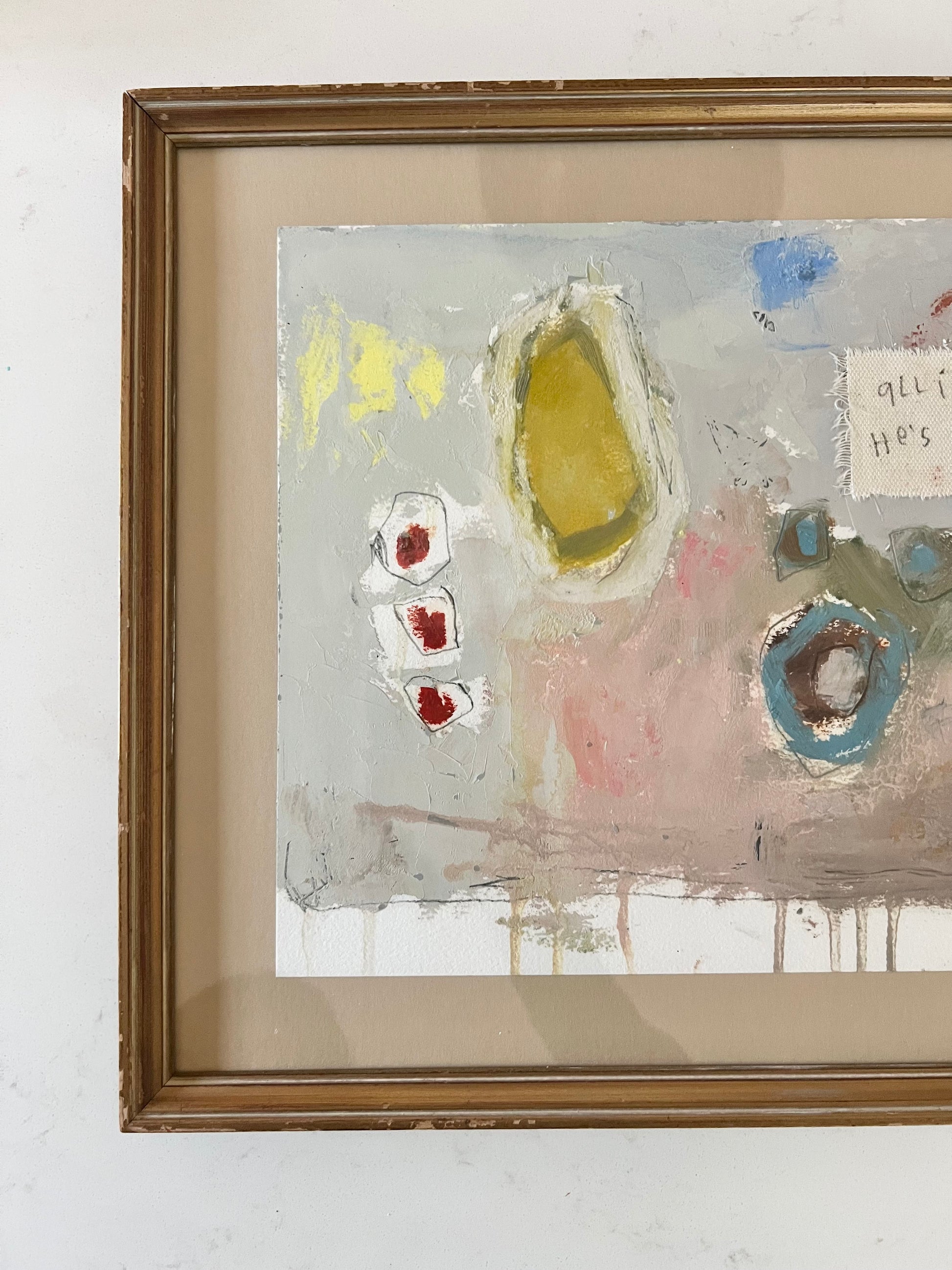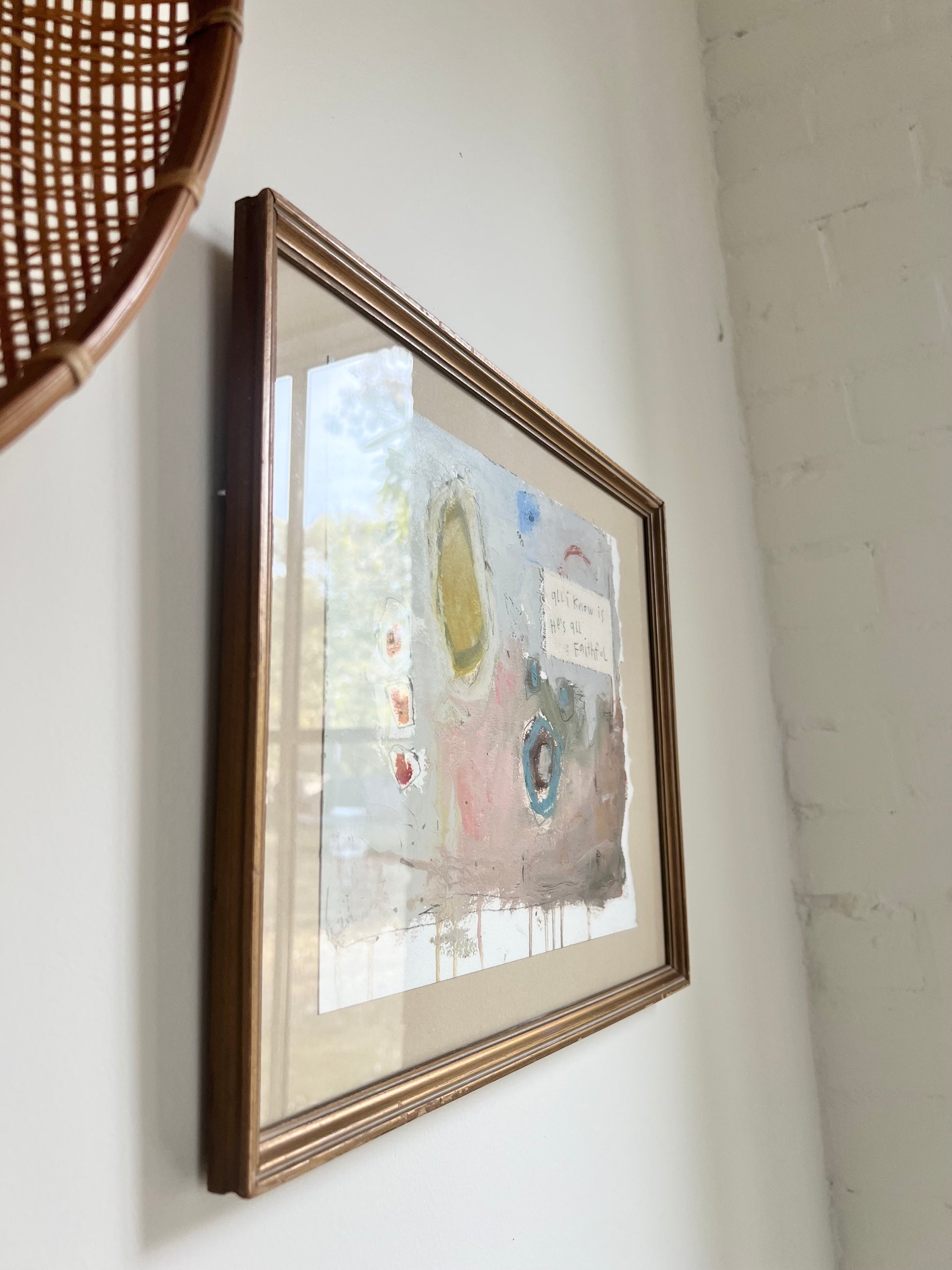 Abstract mixed media with oil paint, sticks, and pencil work on Arches cold pressed oil paper. Lettering etched into paint. Matted and framed into vintage frame measuring 12x15 inches