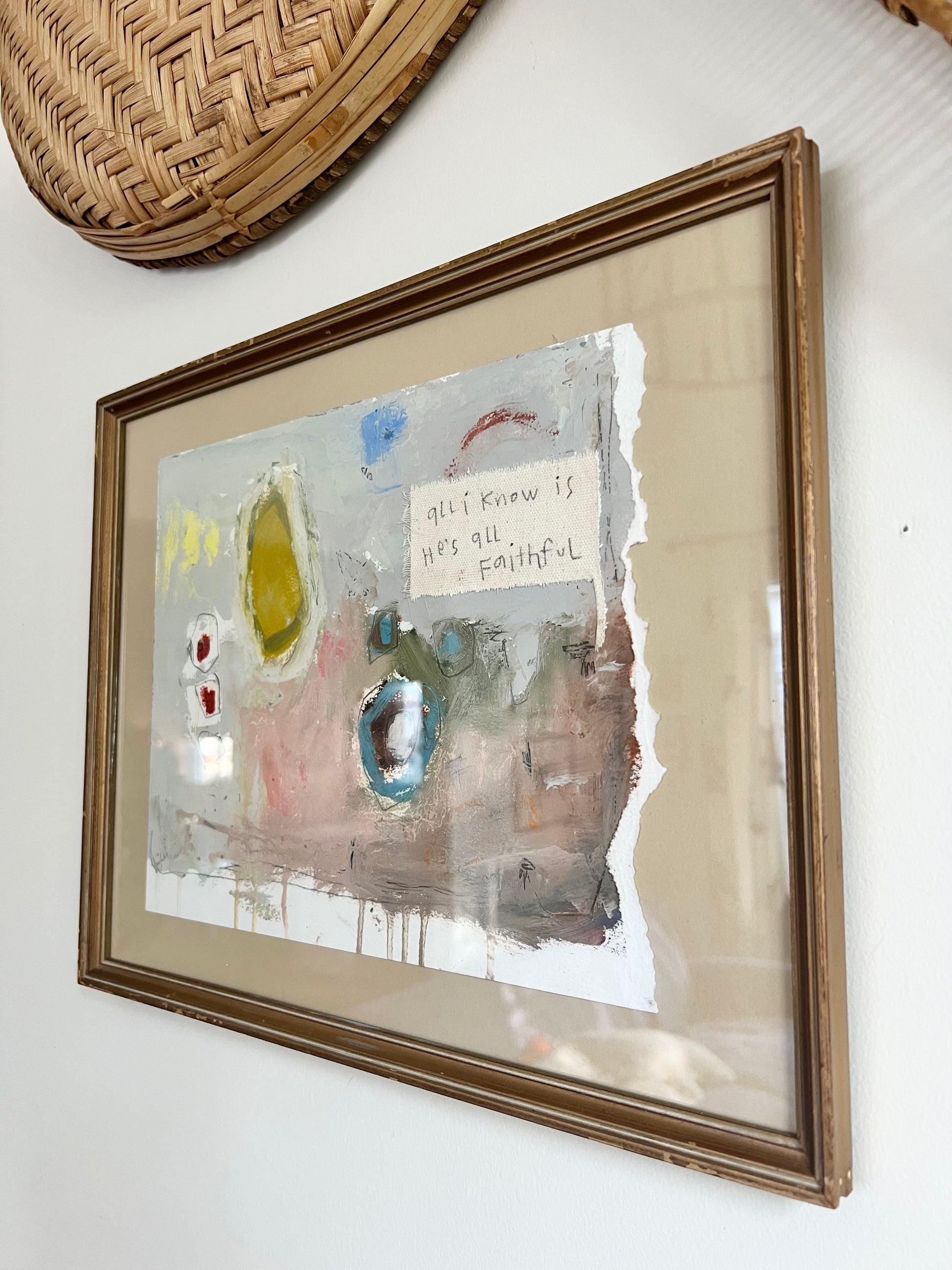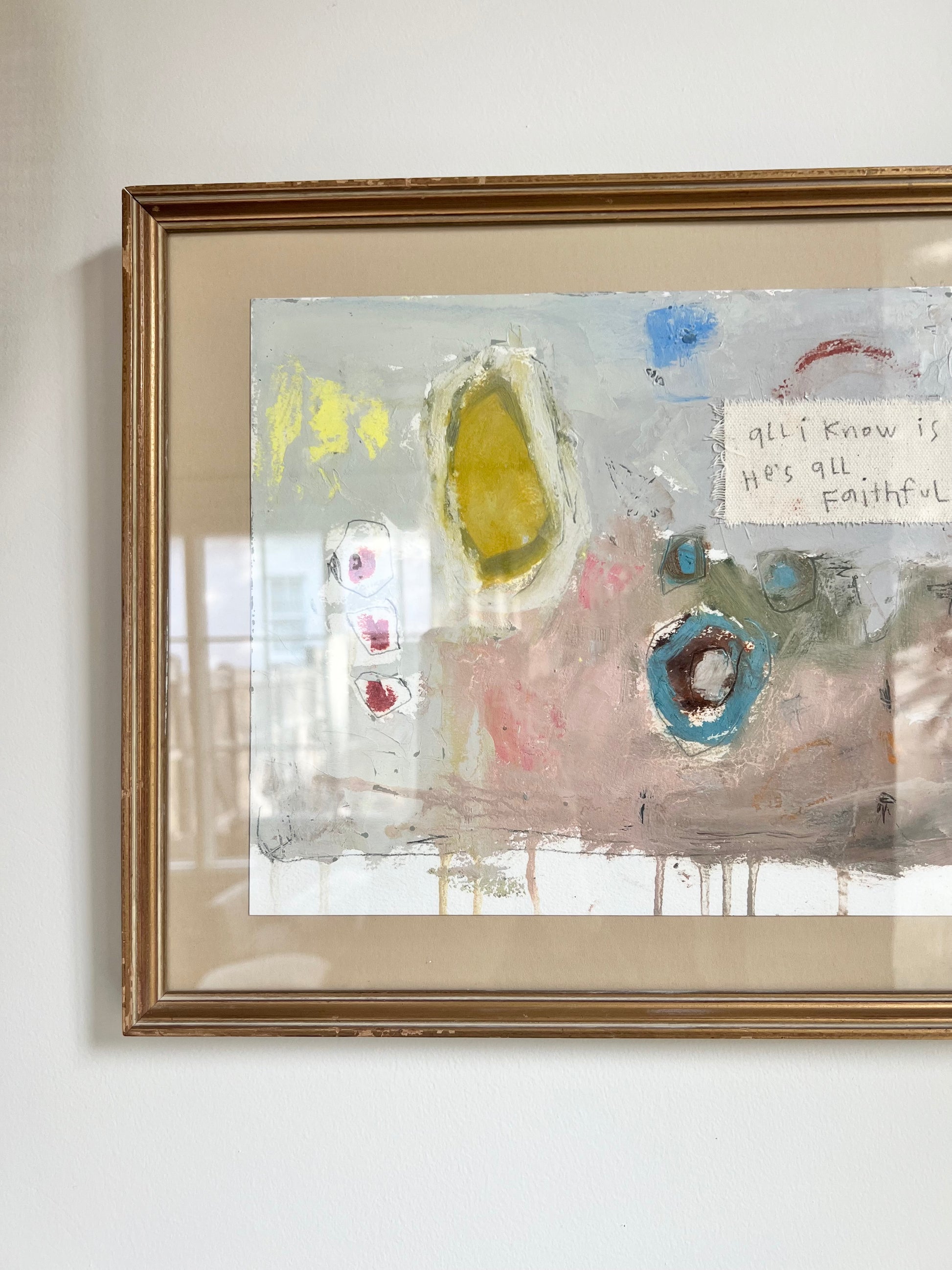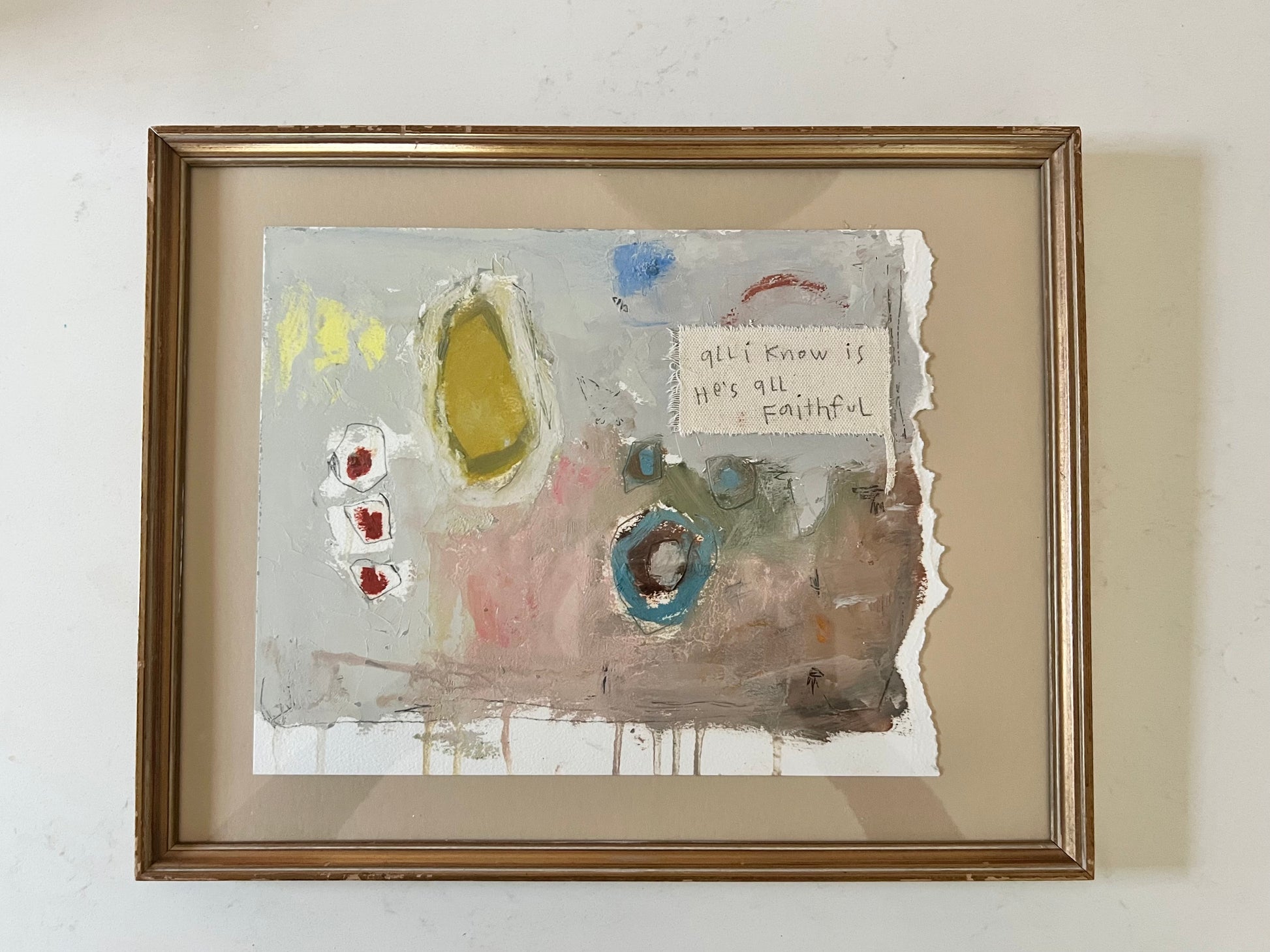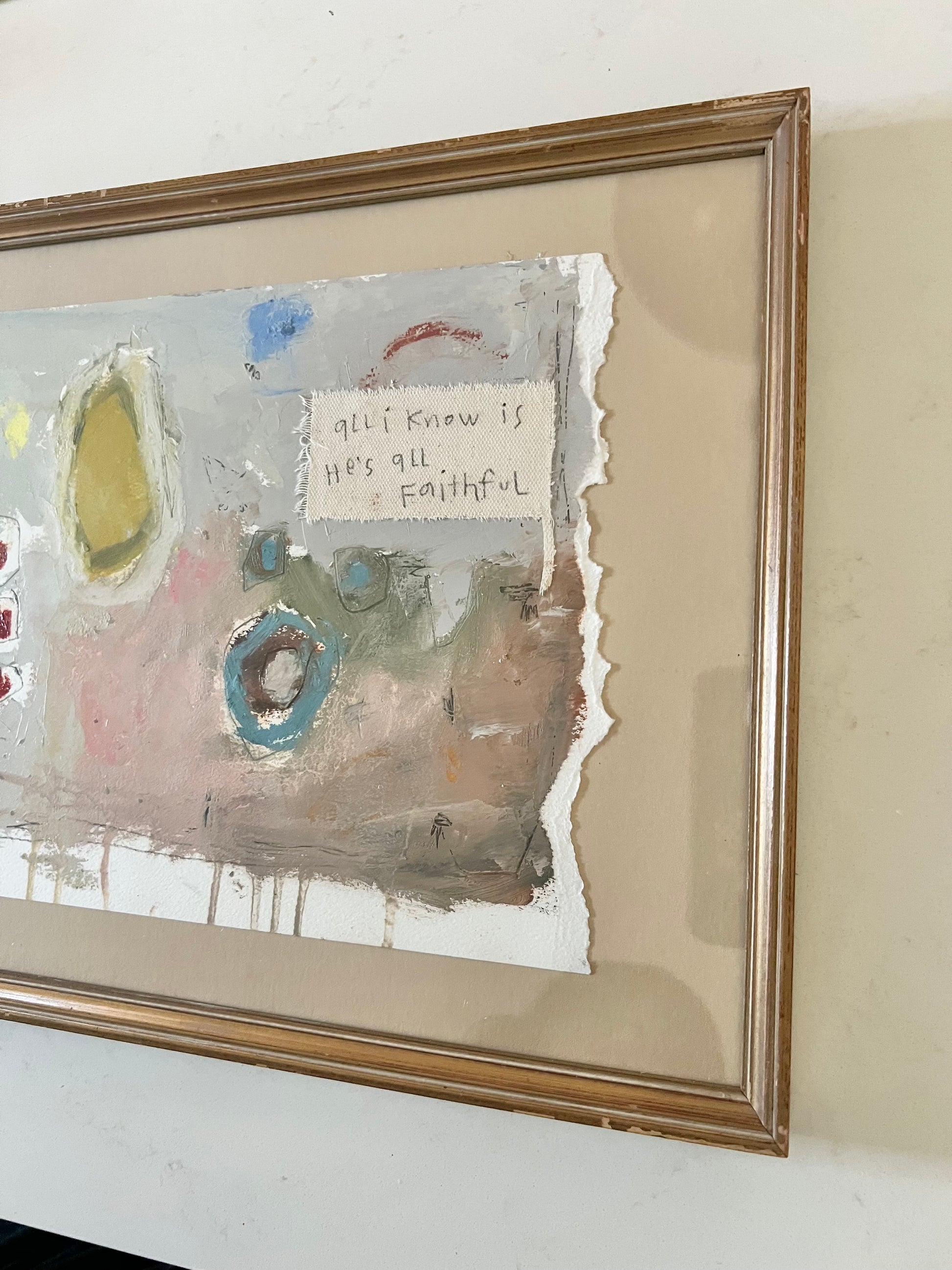 Abstract mixed media with oil paint, sticks, and pencil work on Arches cold pressed oil paper. Lettering etched into paint. Matted and framed into vintage frame measuring 12x15 inches