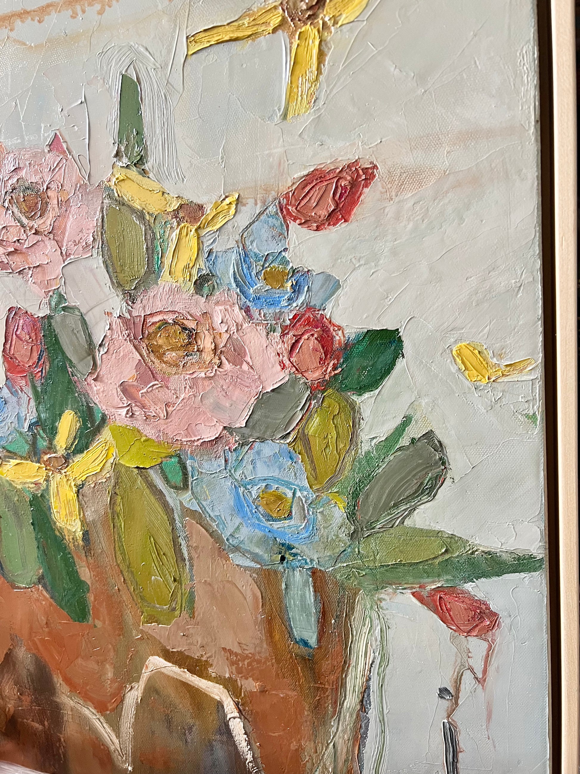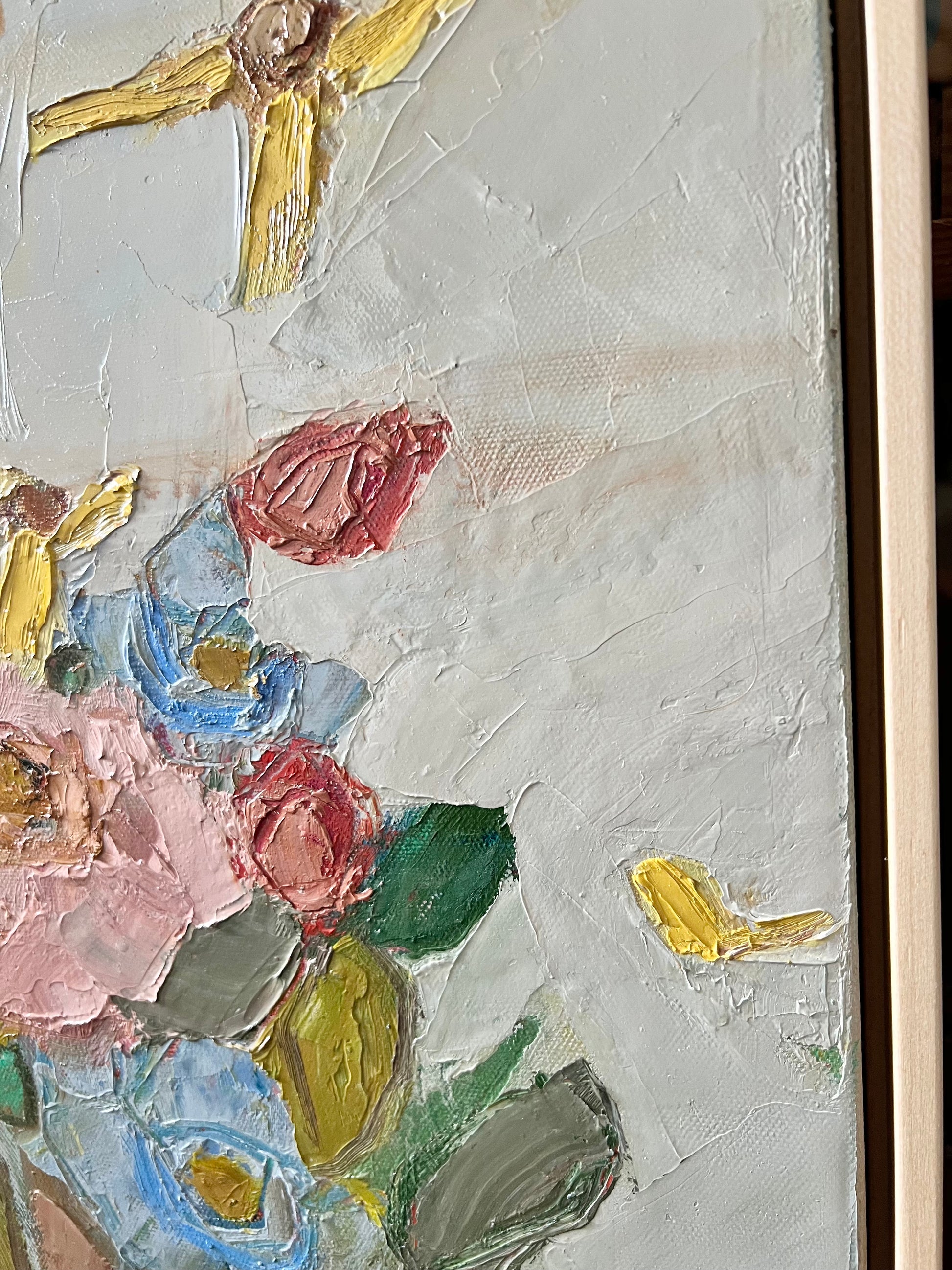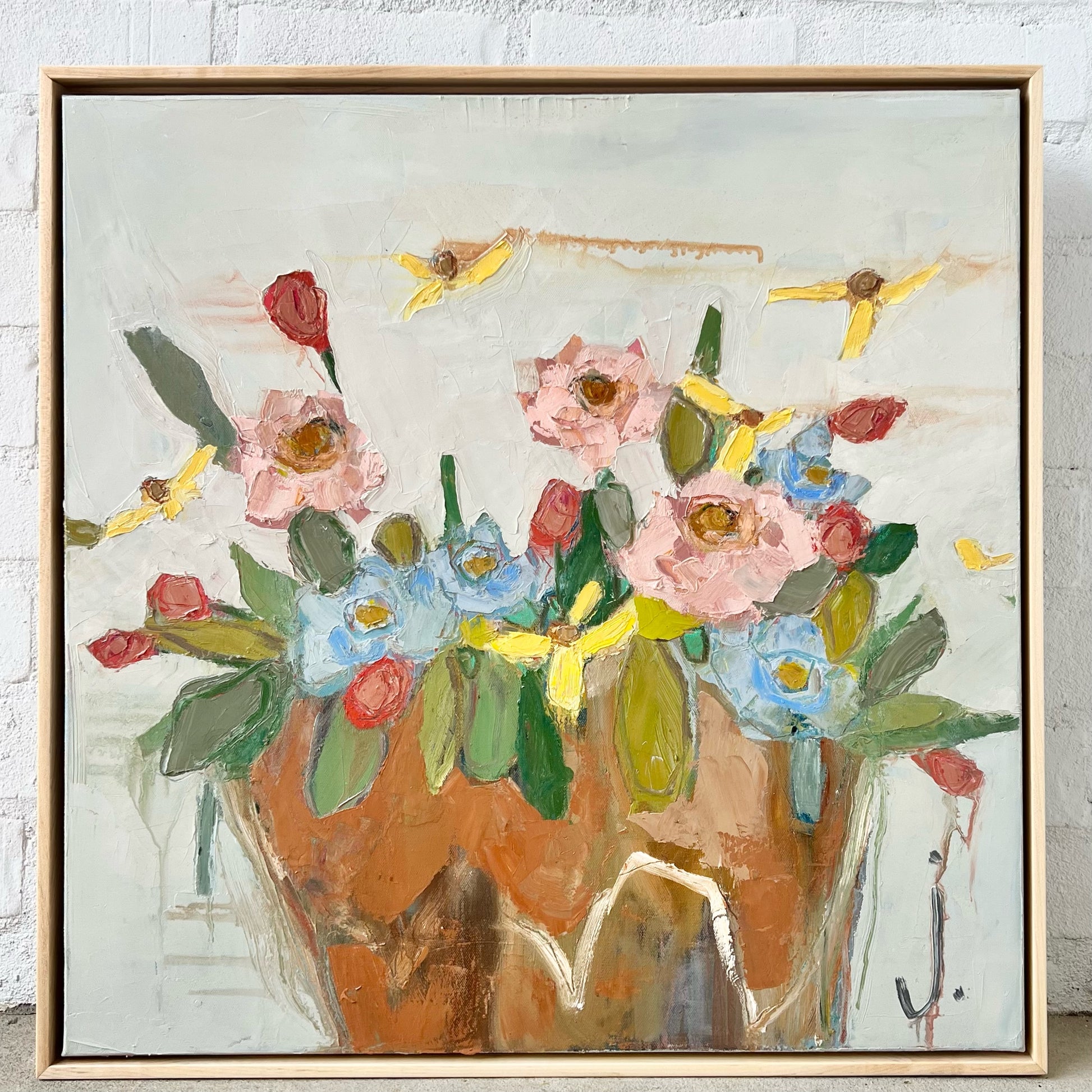 Textured original floral oil panting on gallery wrap canvas. Finished in floating natural maple frame. Canvas measures 24x24.