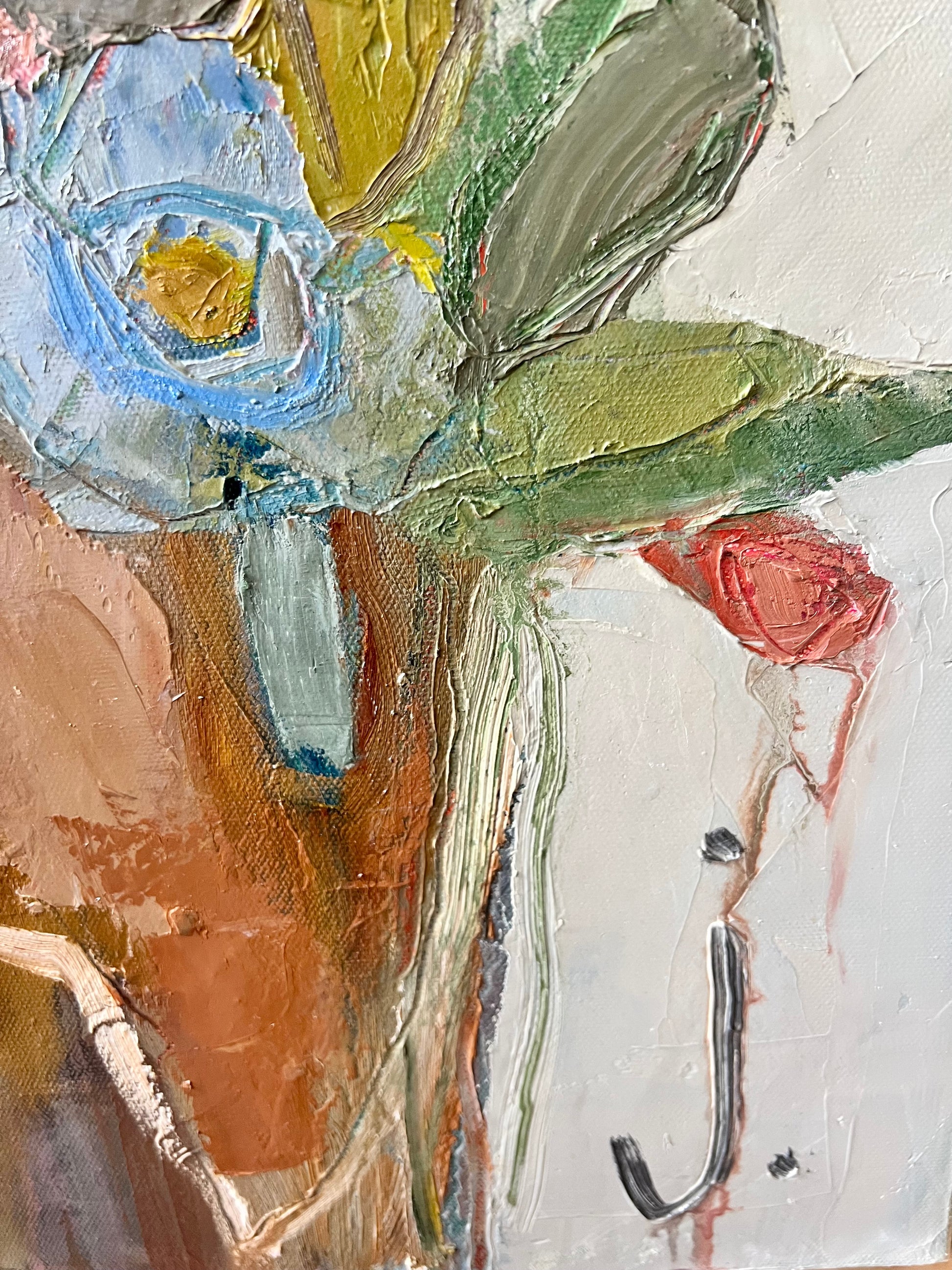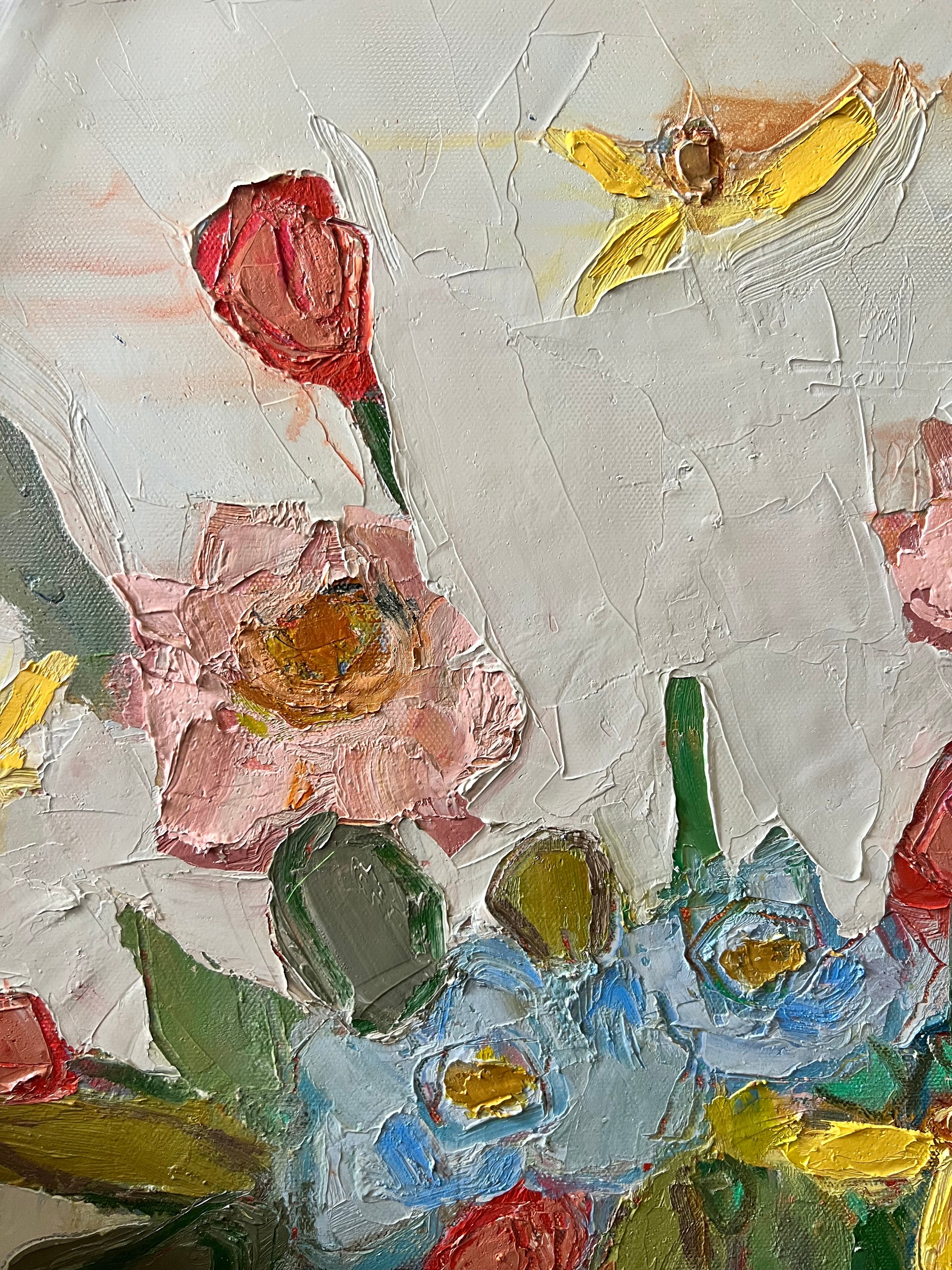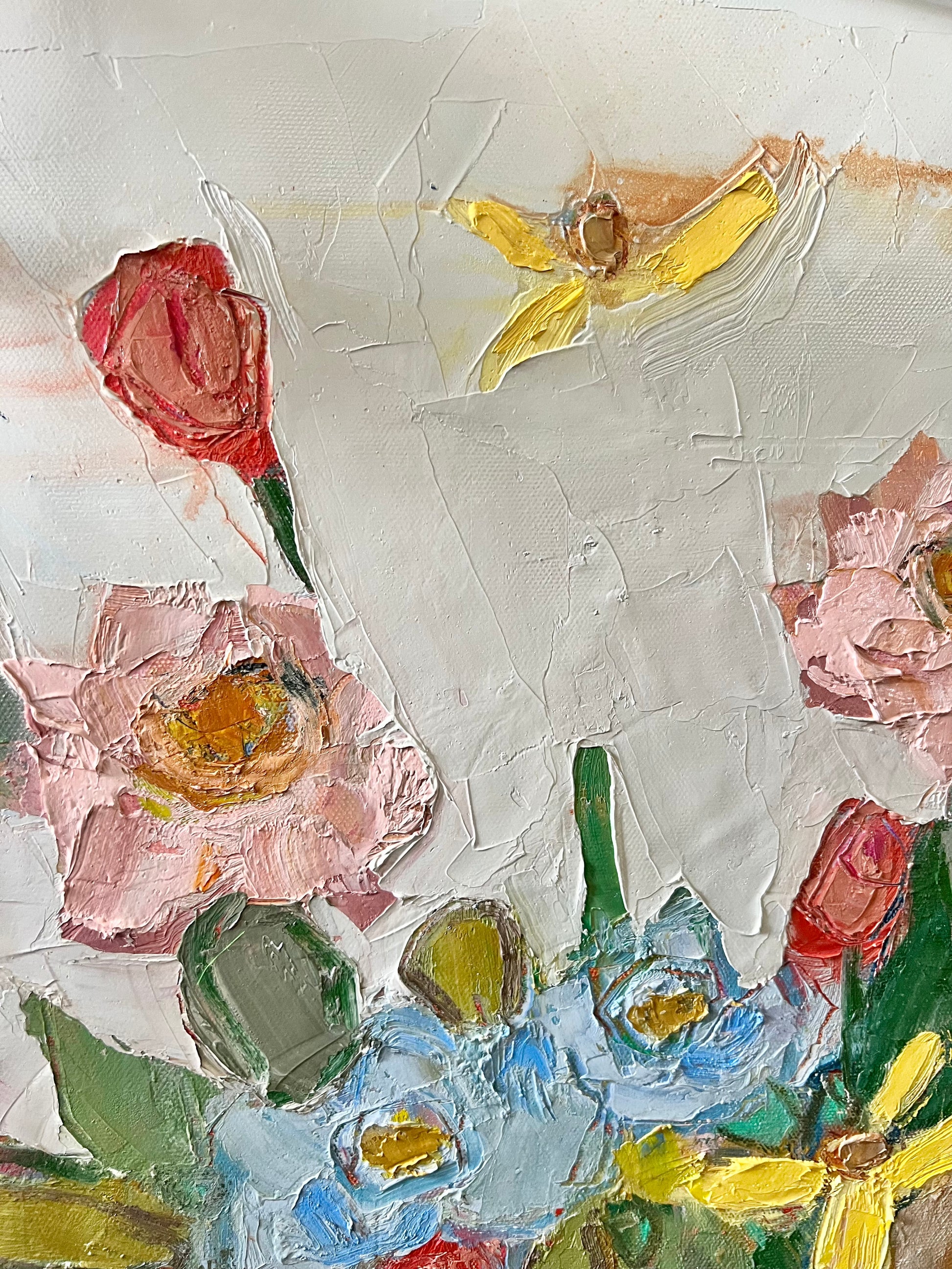 Textured original floral oil panting on gallery wrap canvas. Finished in floating natural maple frame. Canvas measures 24x24.