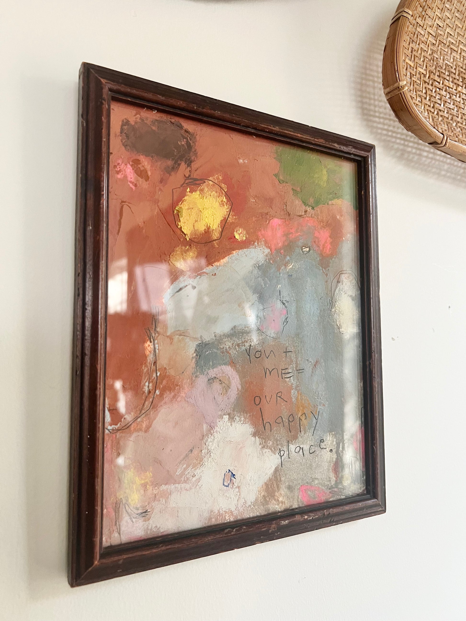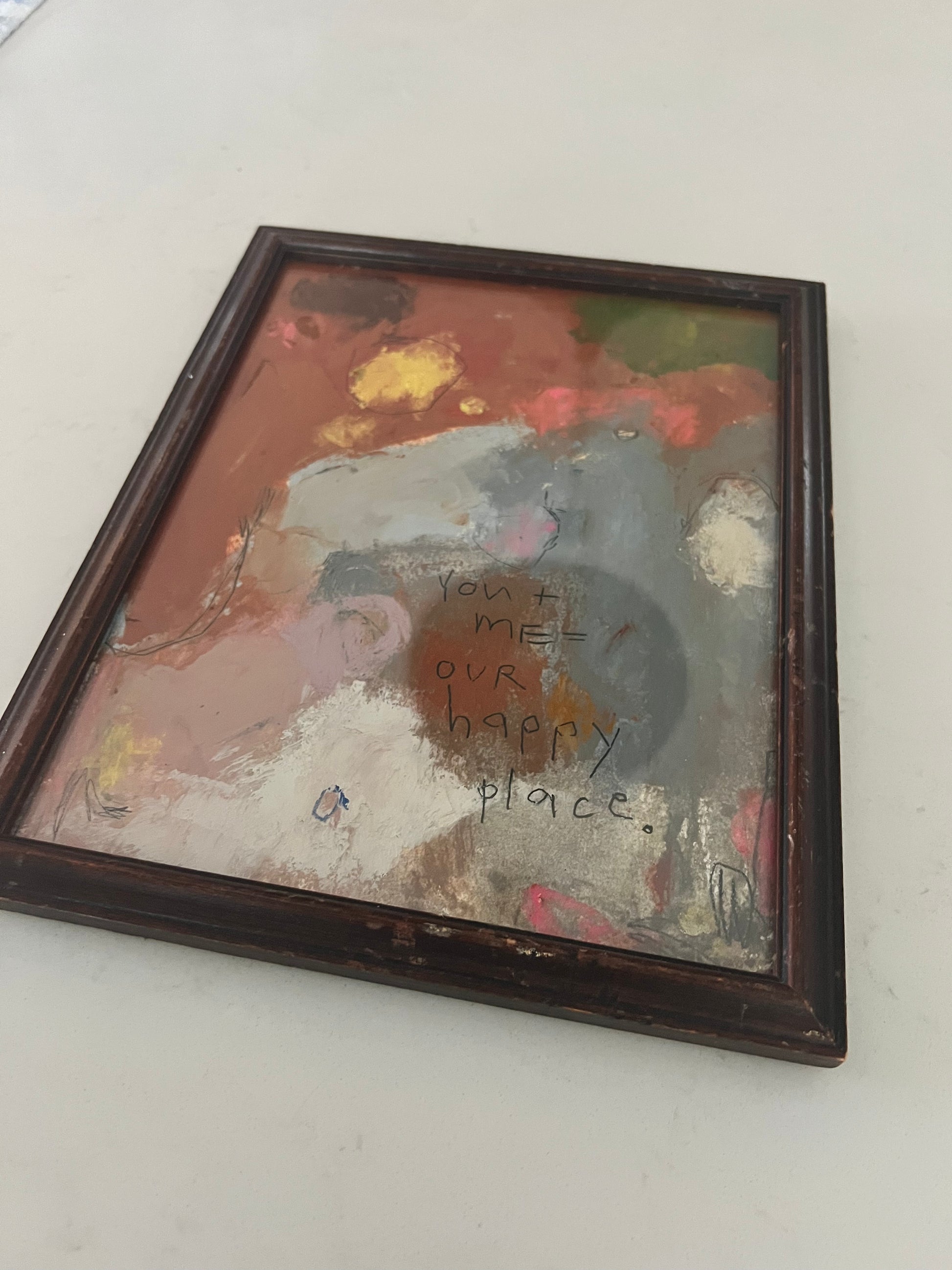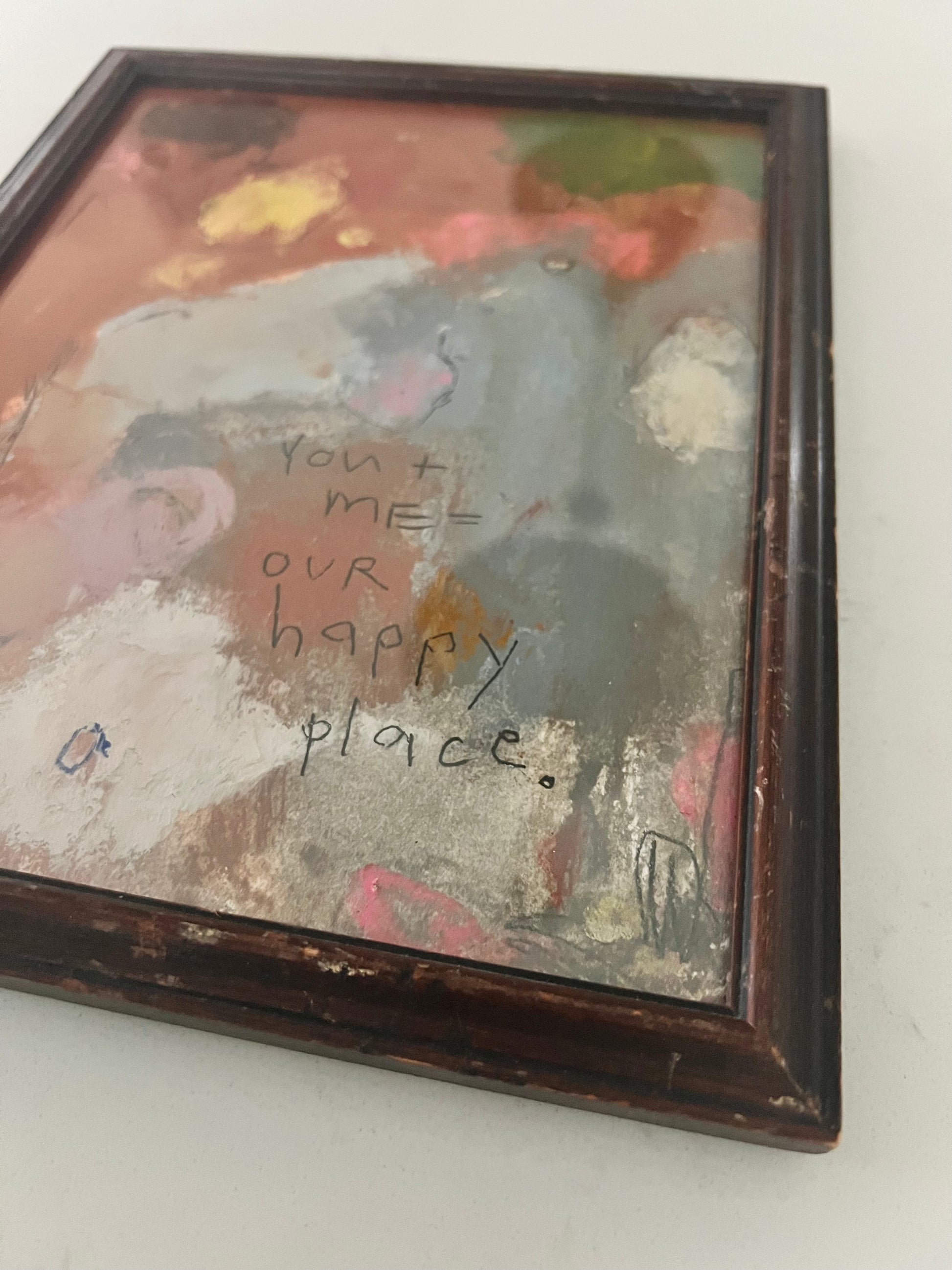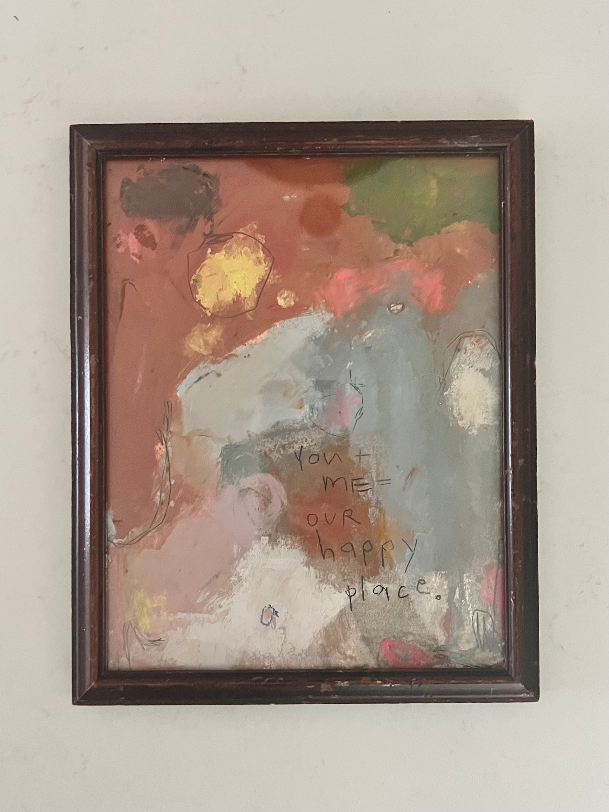 Mixed media oils- paint, pastels and crayons on Arches archival paper framed in vintage wood frame.