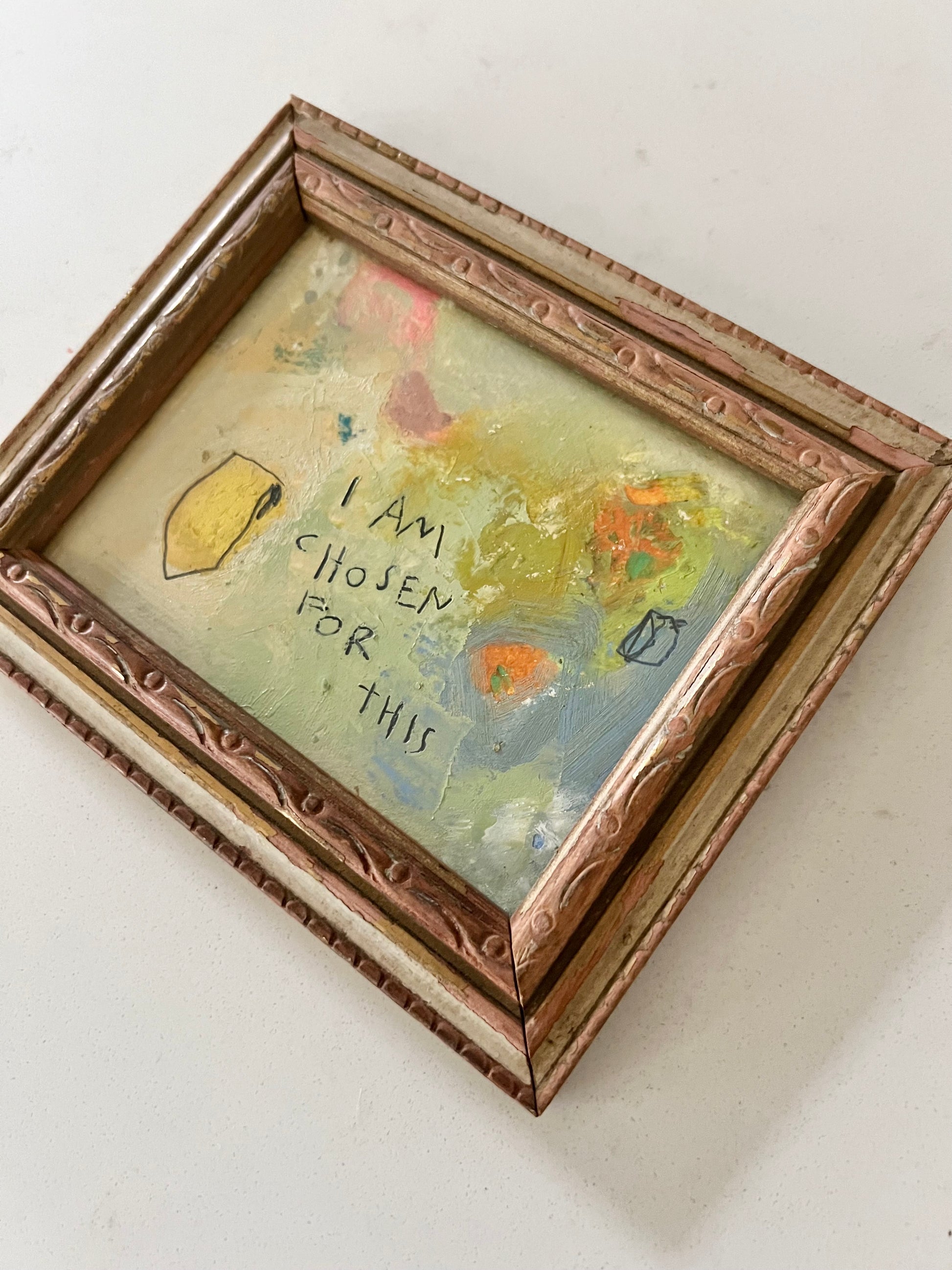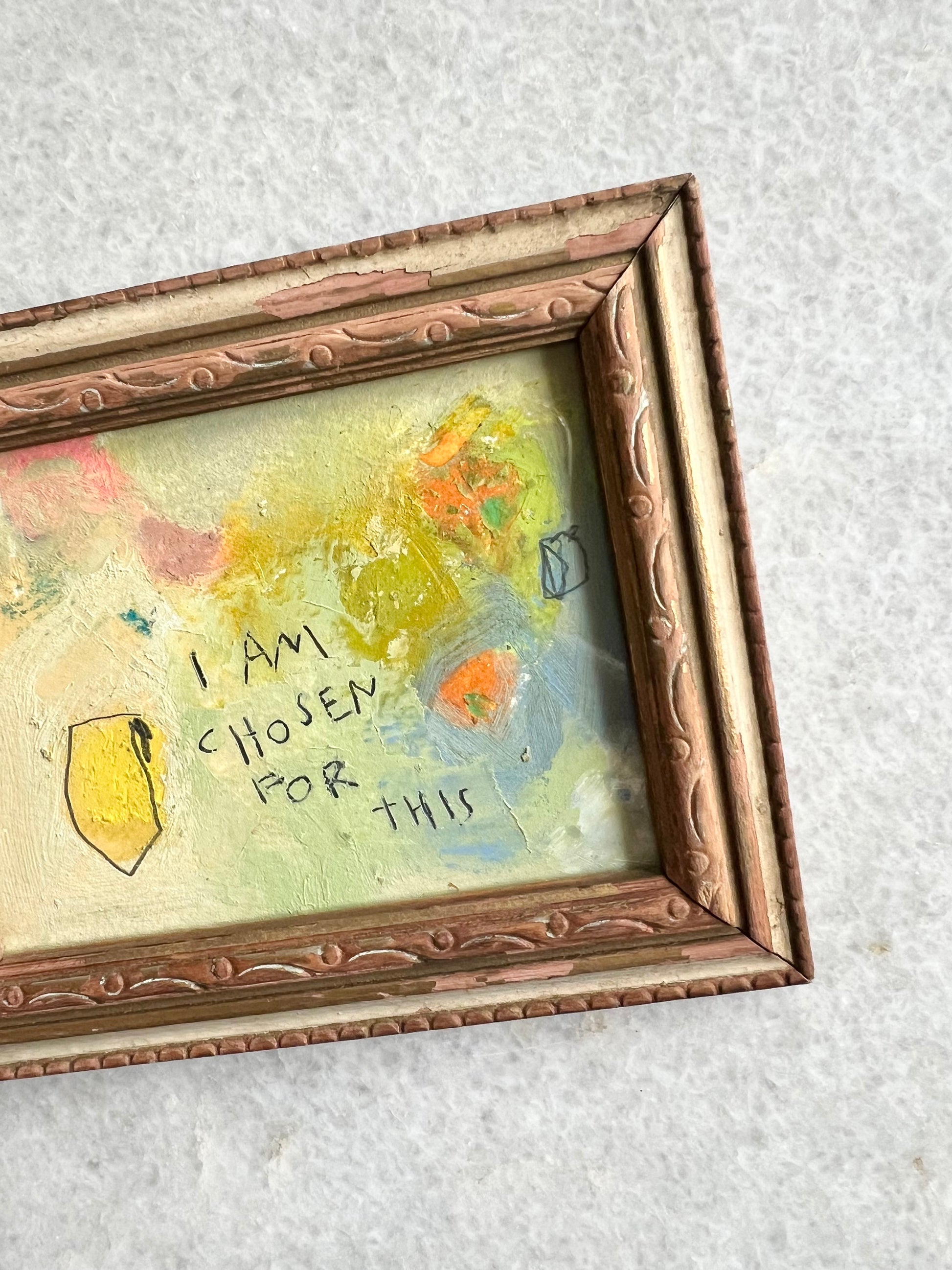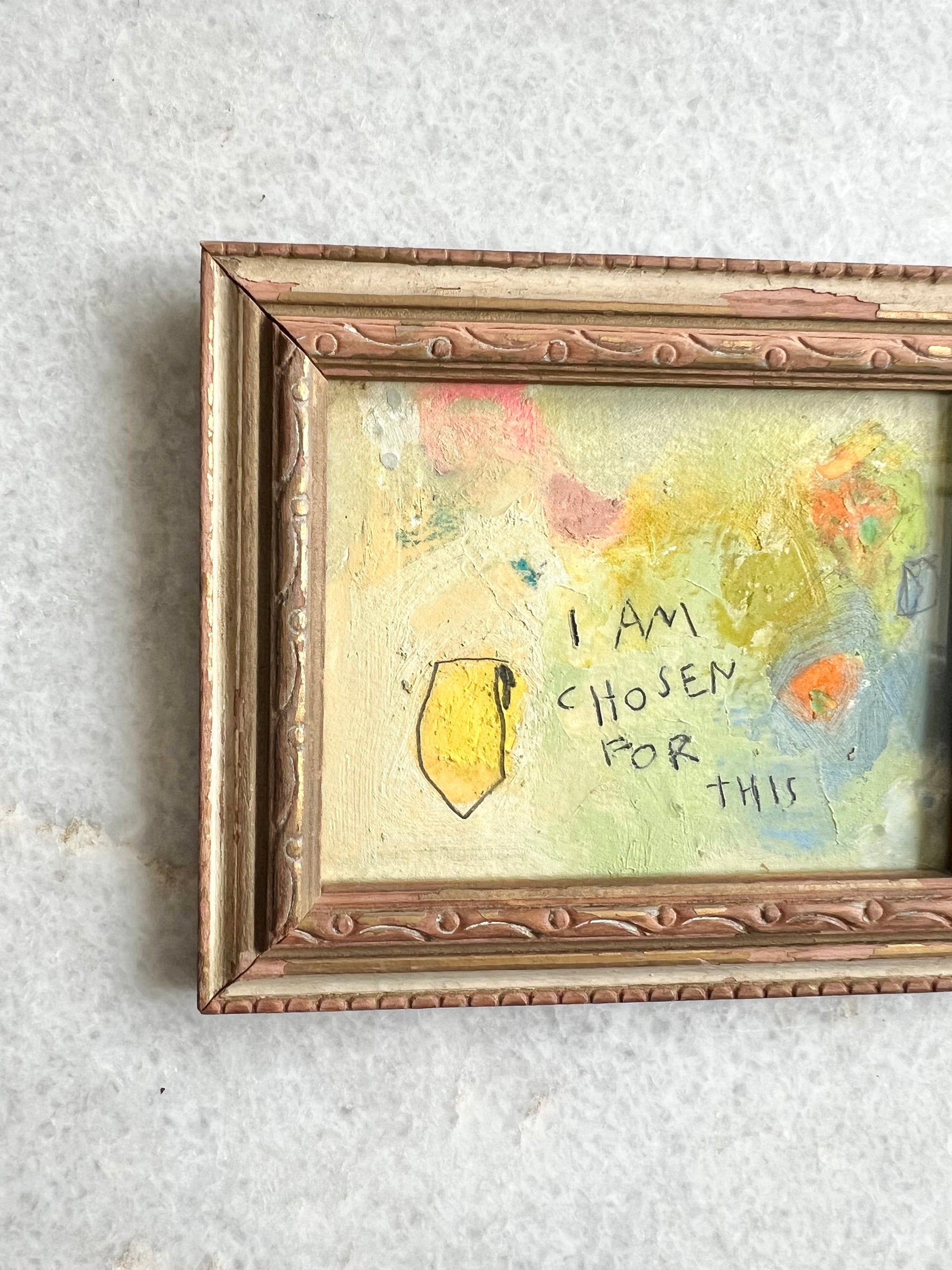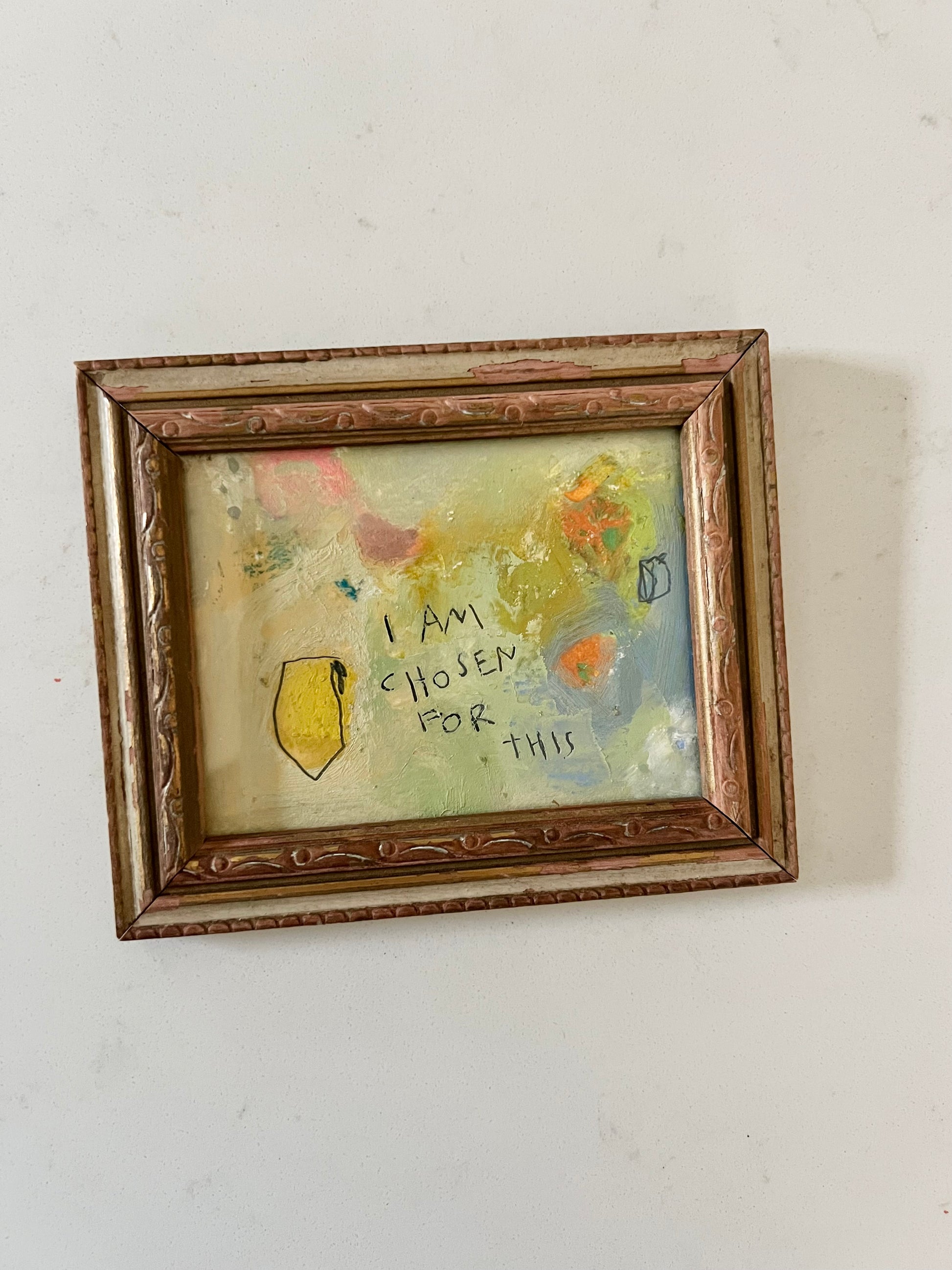 Abstract oil sketch on Arches archival cold wax paper. Finished and framed in a vintage lemon yellow frame that comes already loved. Measures approximately 5x6 inches including frame.