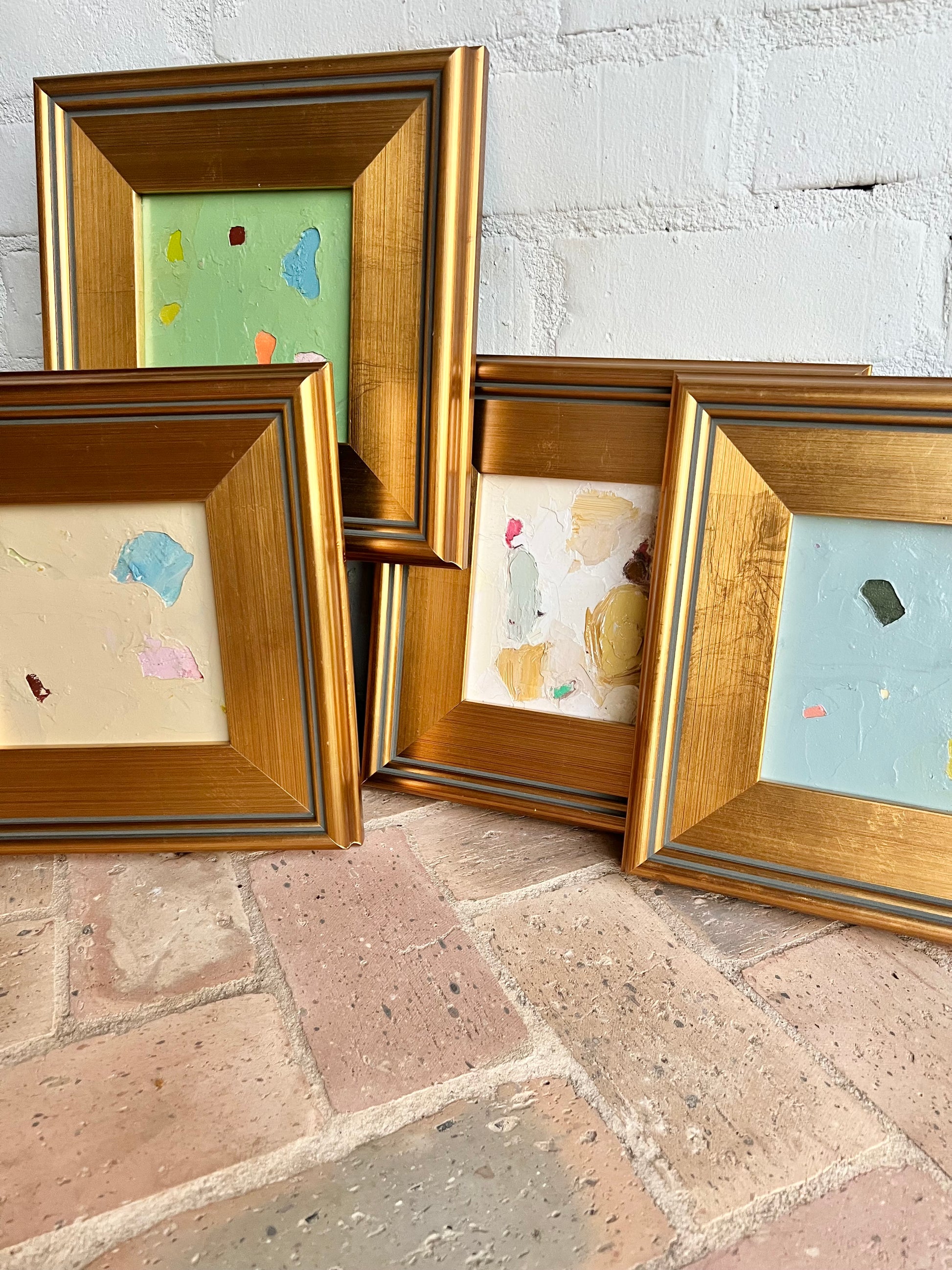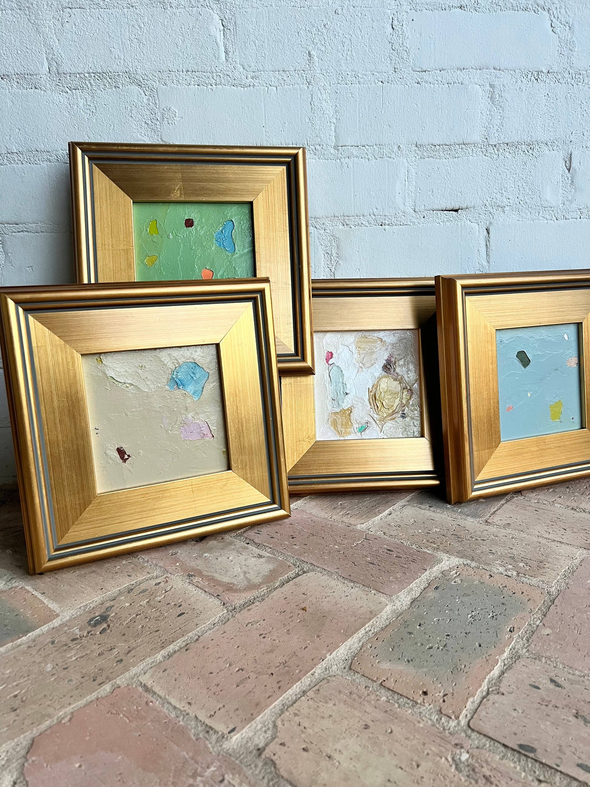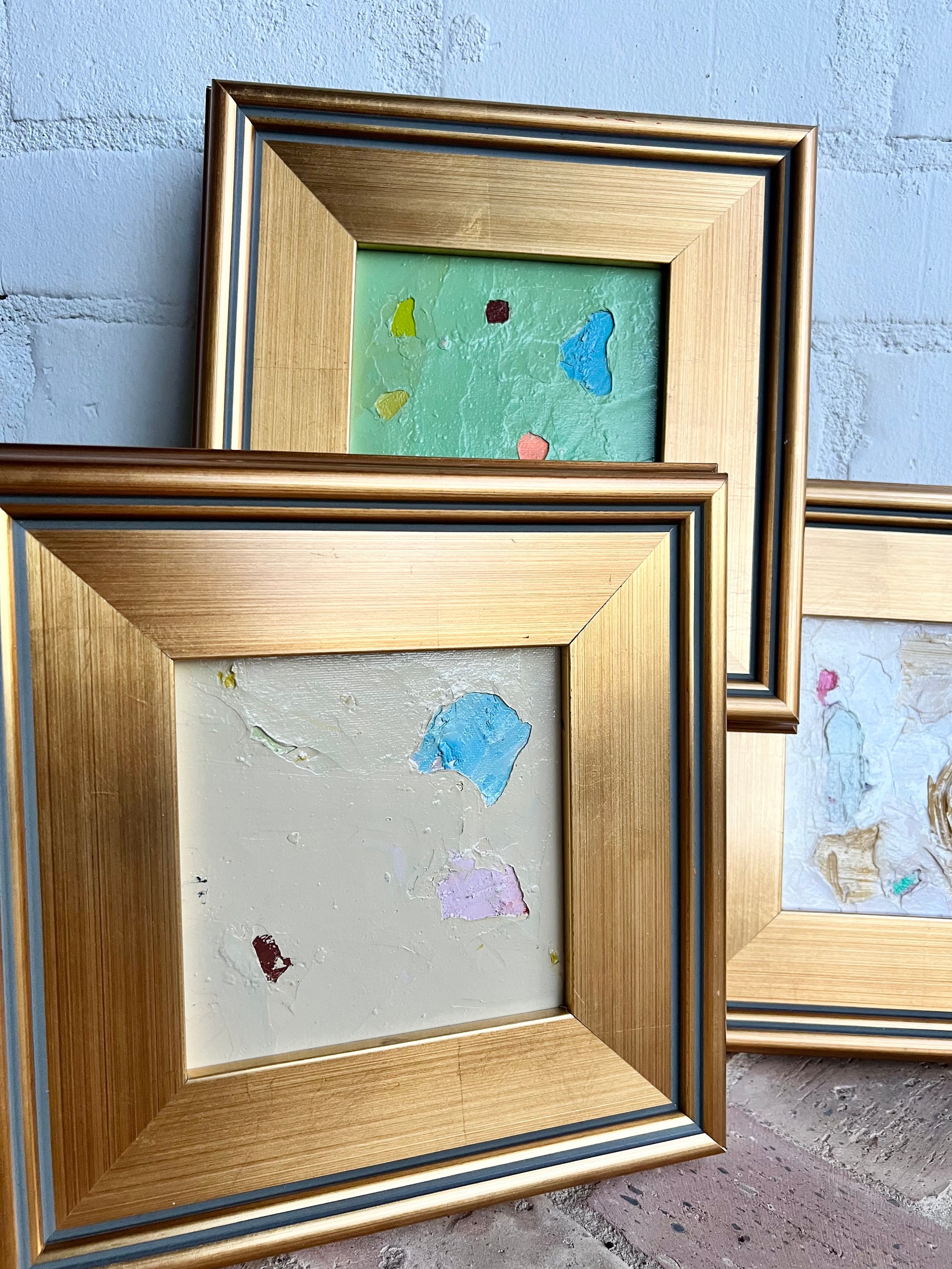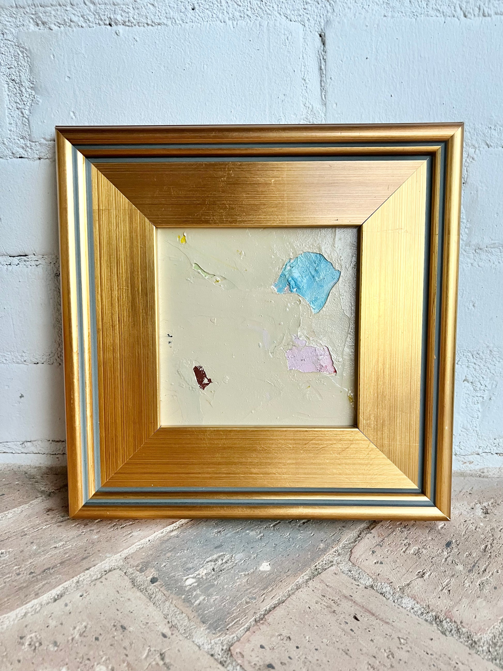 6x6 abstract oil and cold wax painting finished in chunky gold fine art frame.