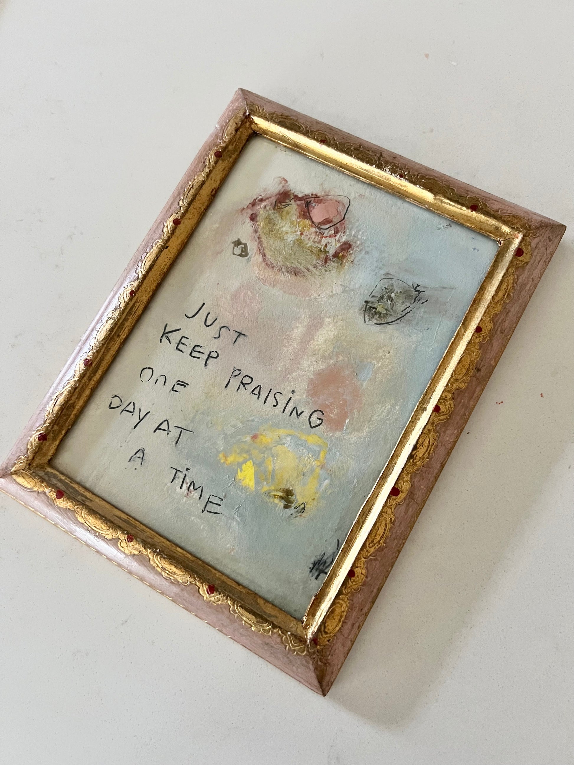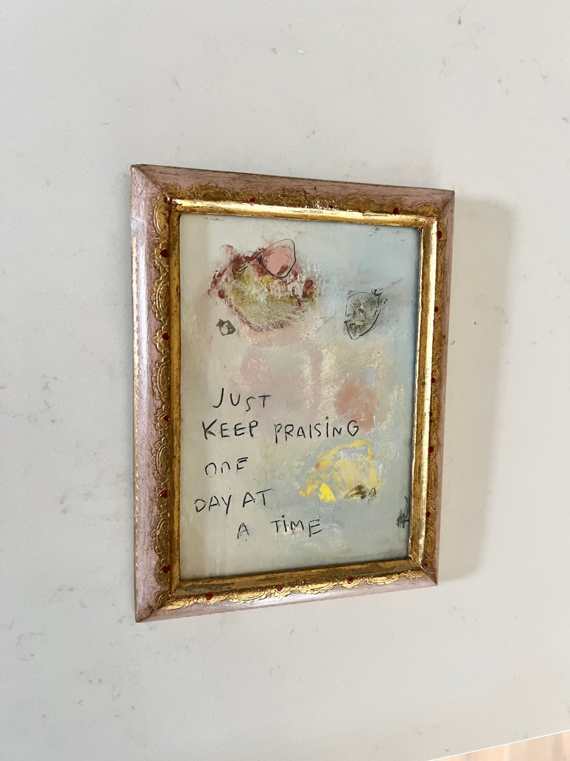 Abstract oil sketch on Arches archival cold wax paper. Finished and framed in a vintage lemon yellow frame that comes already loved. Measures approximately 5.5x7 inches including frame.
