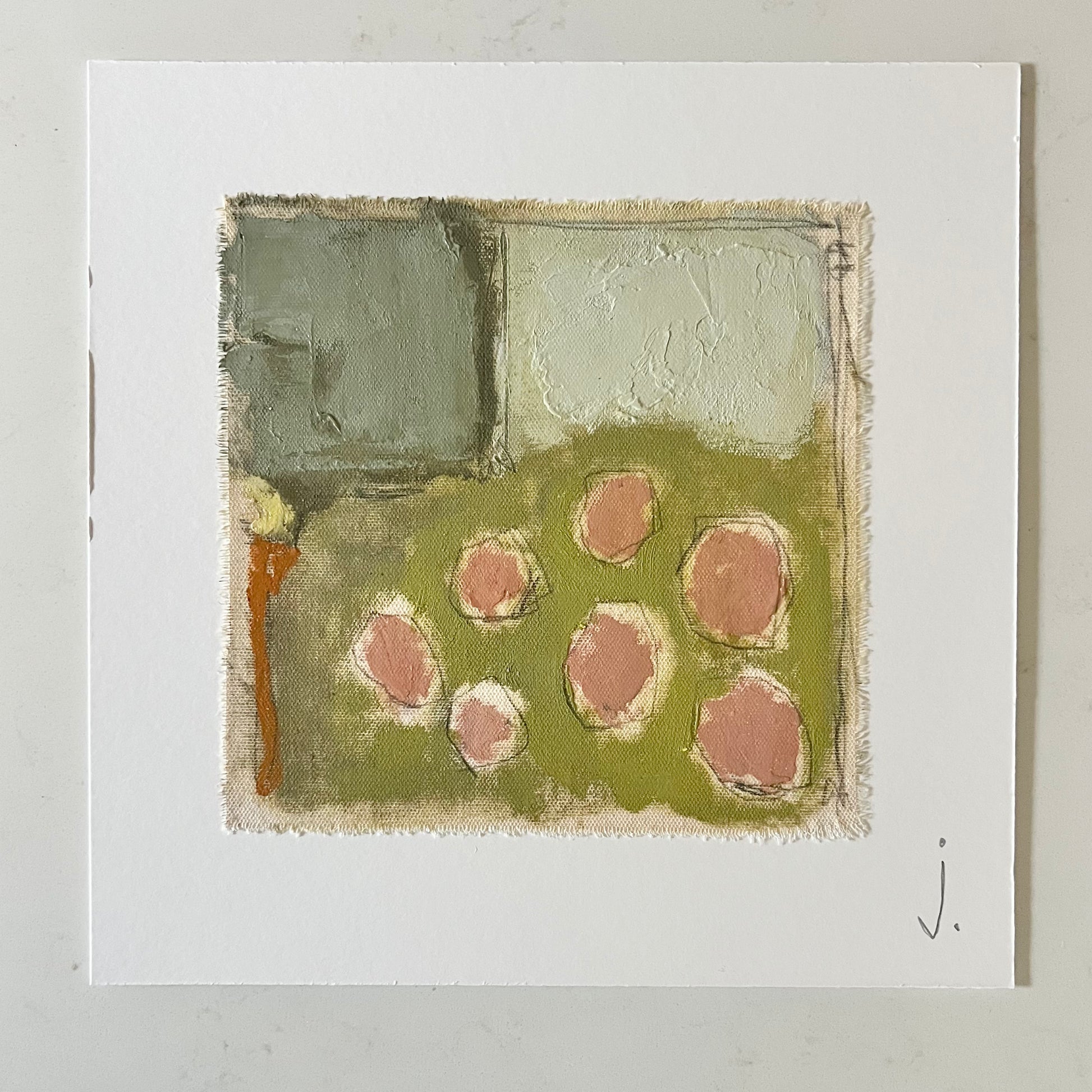 Abstract oil paint and pastel work on canvas matted and ready to frame. Art work measures 8x8 inches, mat measures 12x12 inches.