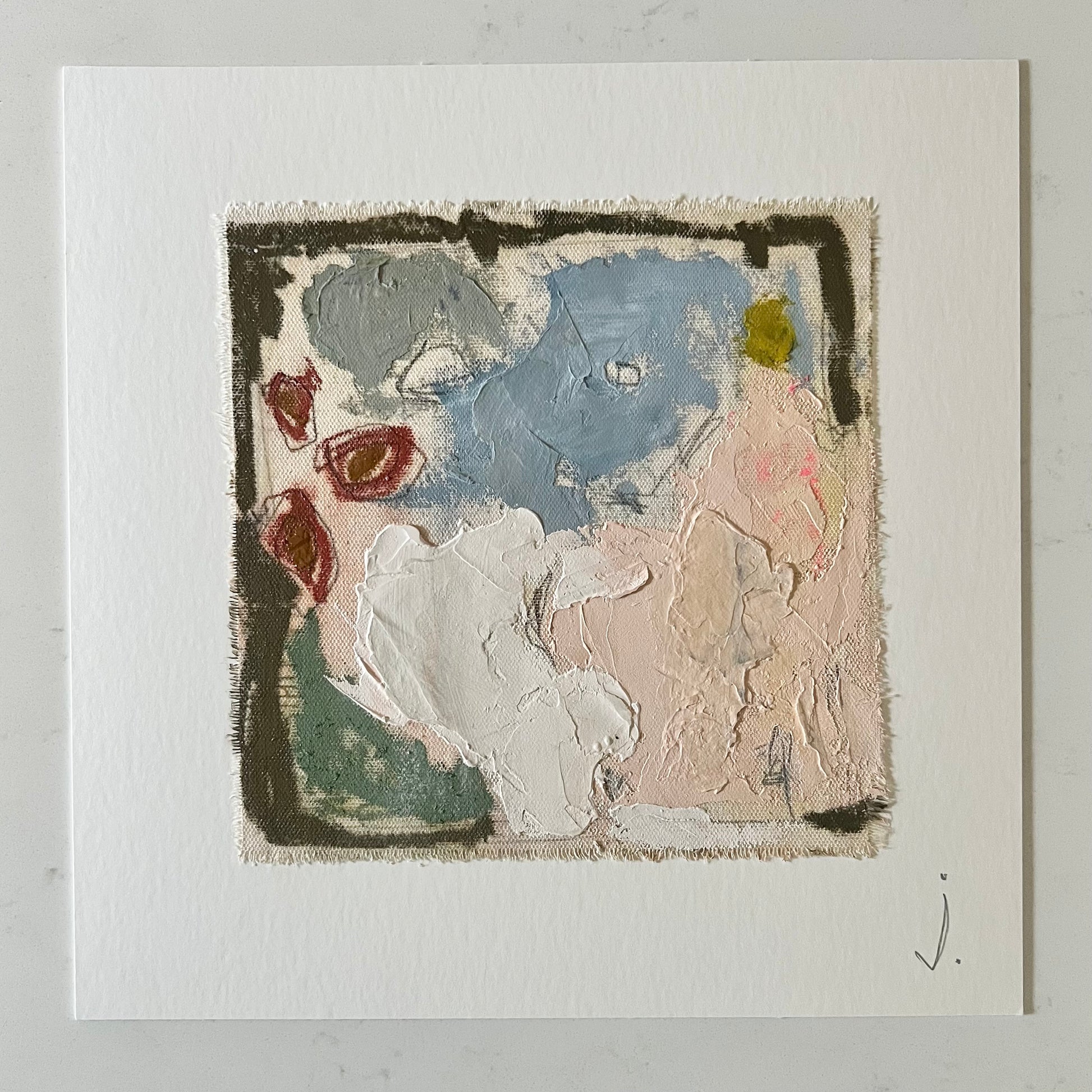 Abstract oil paint and pastel work on canvas matted and ready to frame. Art work measures 8x8 inches, mat measures 12x12 inches.
