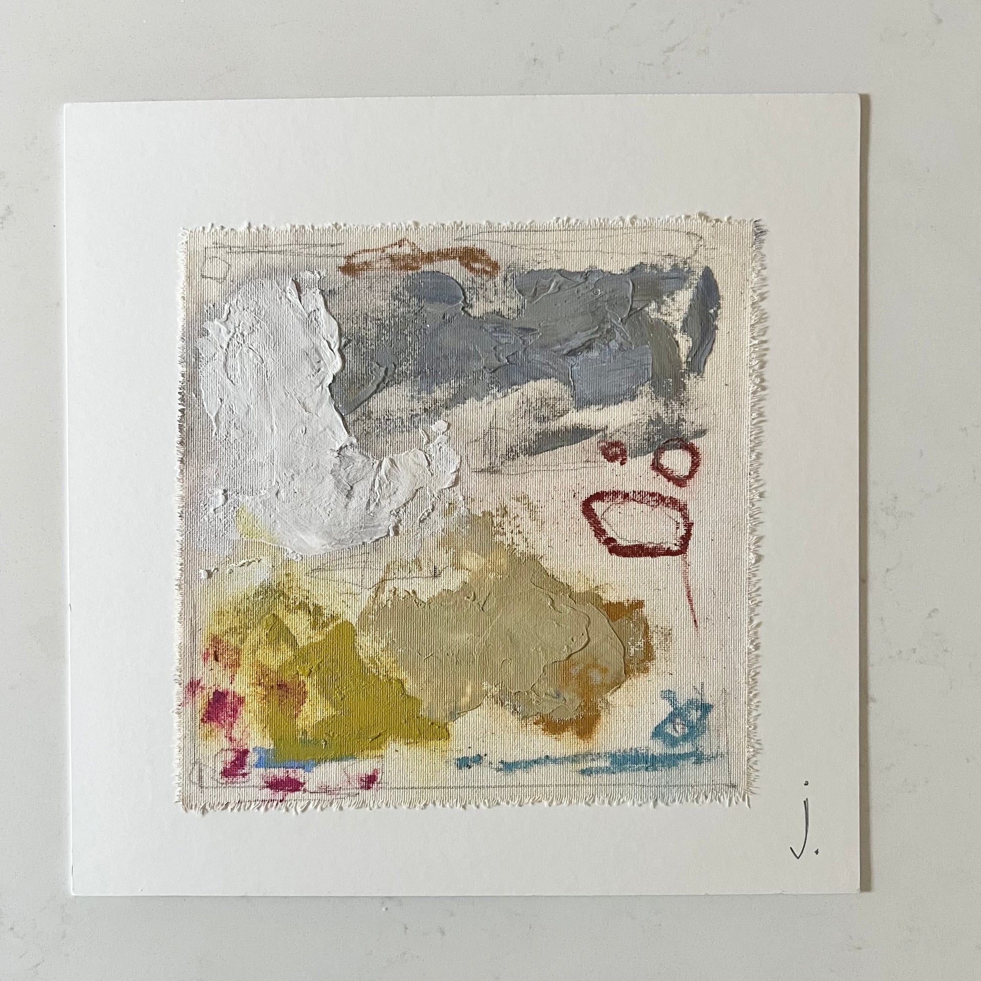 Abstract oil paint and pastel work on canvas matted and ready to frame. Art work measures 8x8 inches, mat measures 12x12 inches.