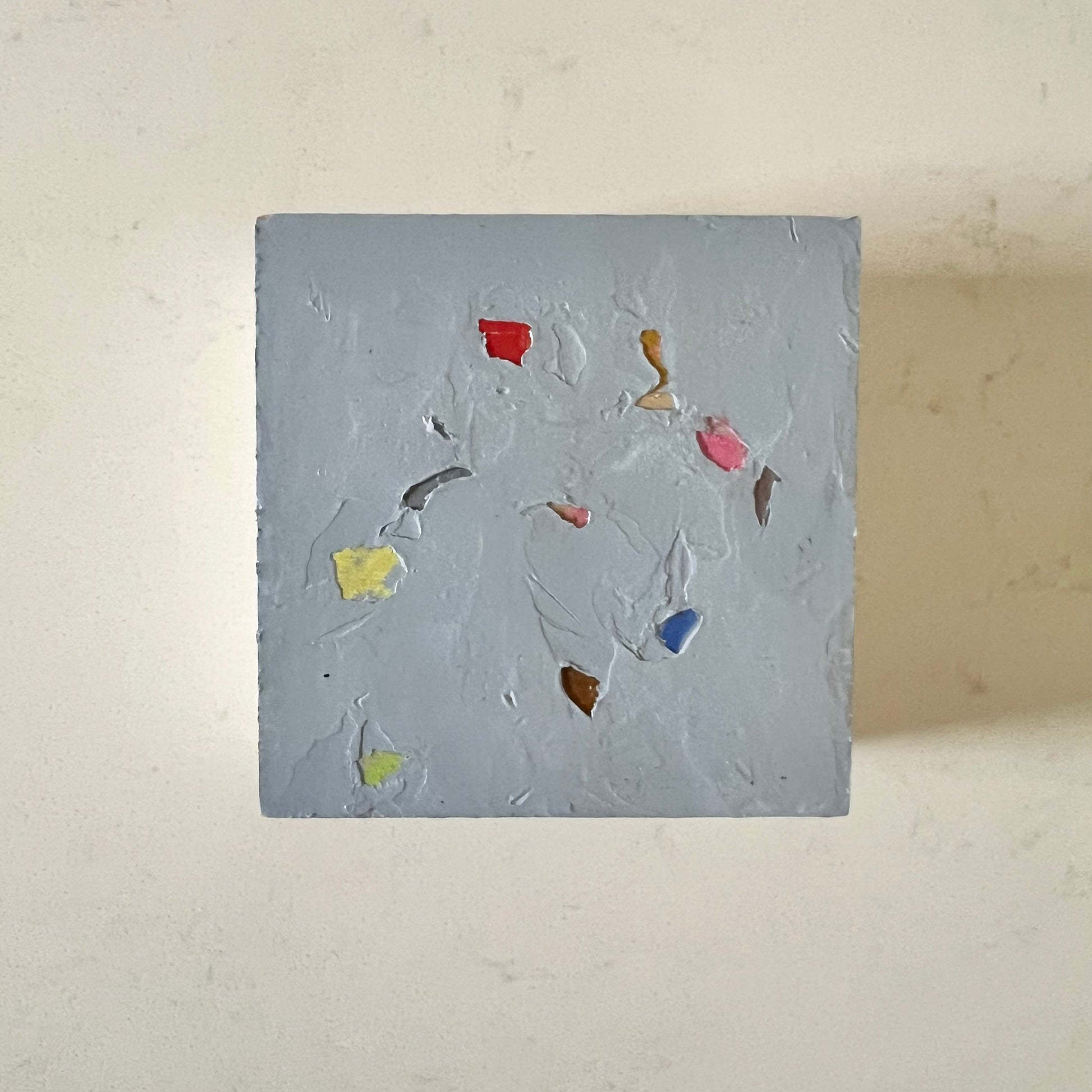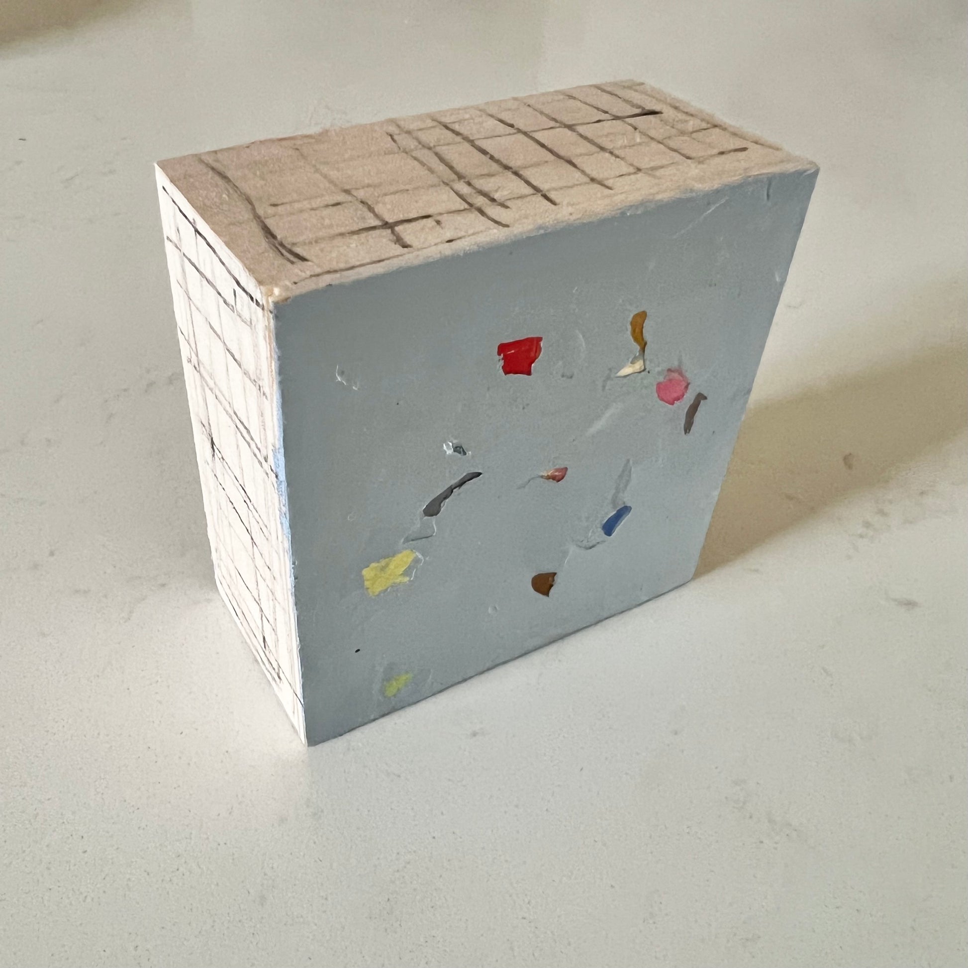 3 x 3 x 2 oil textured abstract on wood block with whimsical detailed edging.