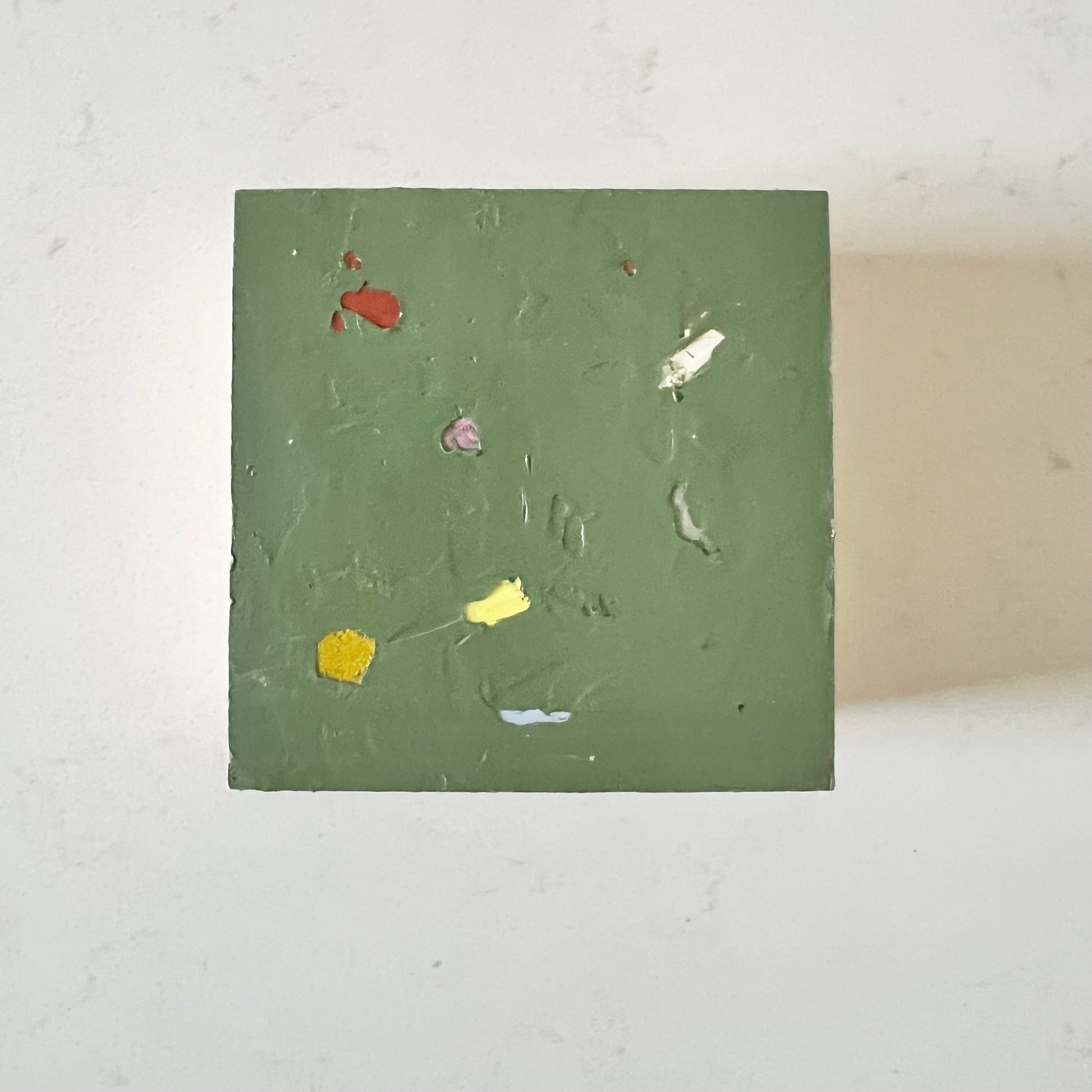 3 x 3 x 2 oil textured abstract on wood block with whimsical detailed edging.