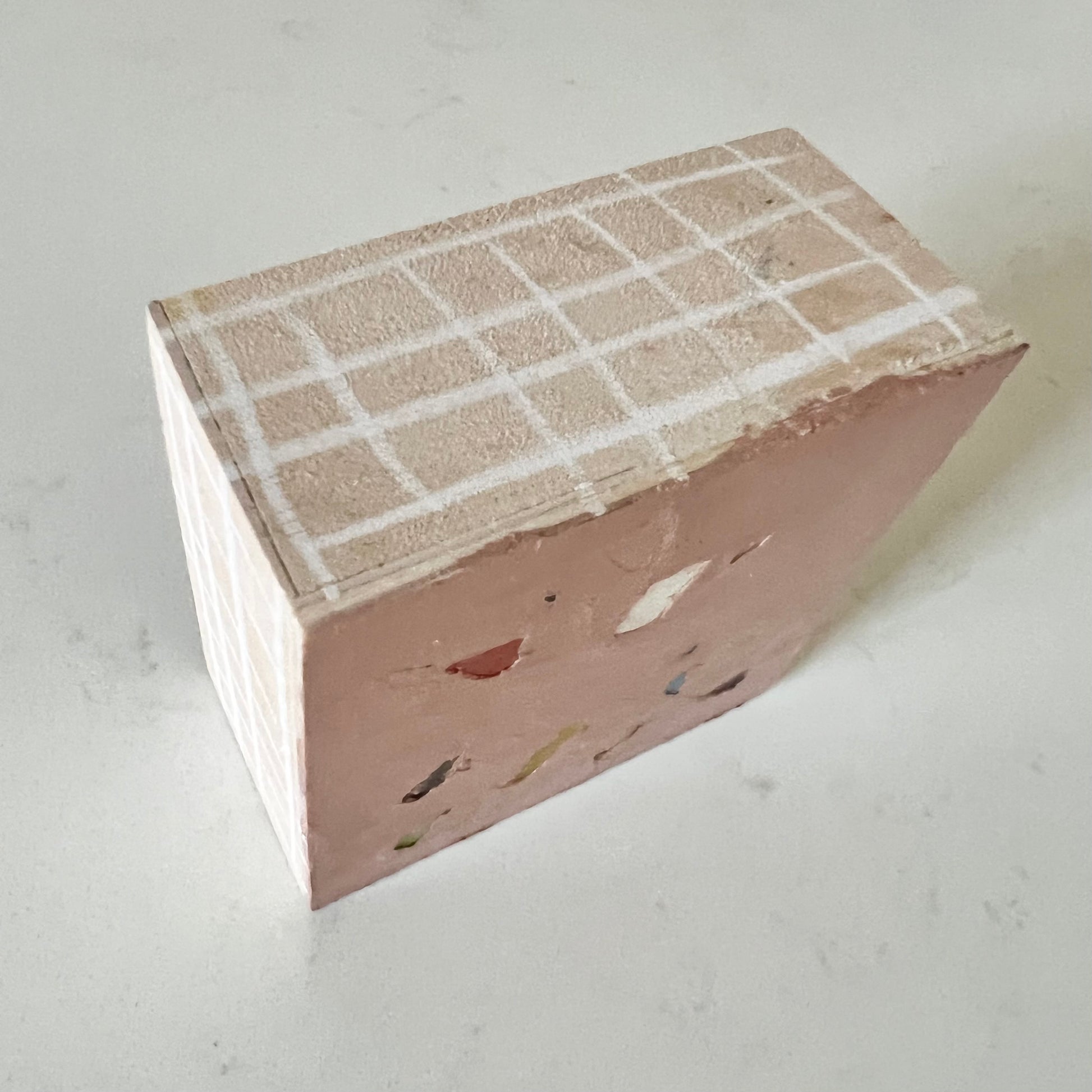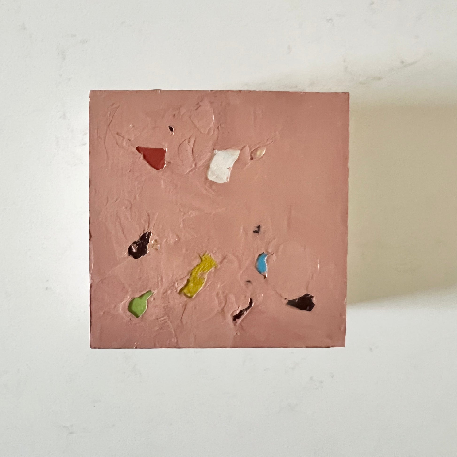 3 x 3 x 2 oil textured abstract on wood block with whimsical detailed edging.
