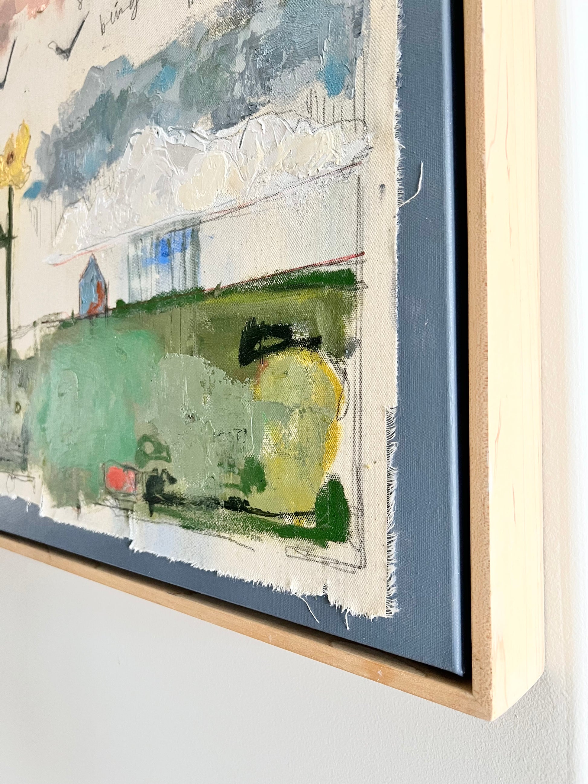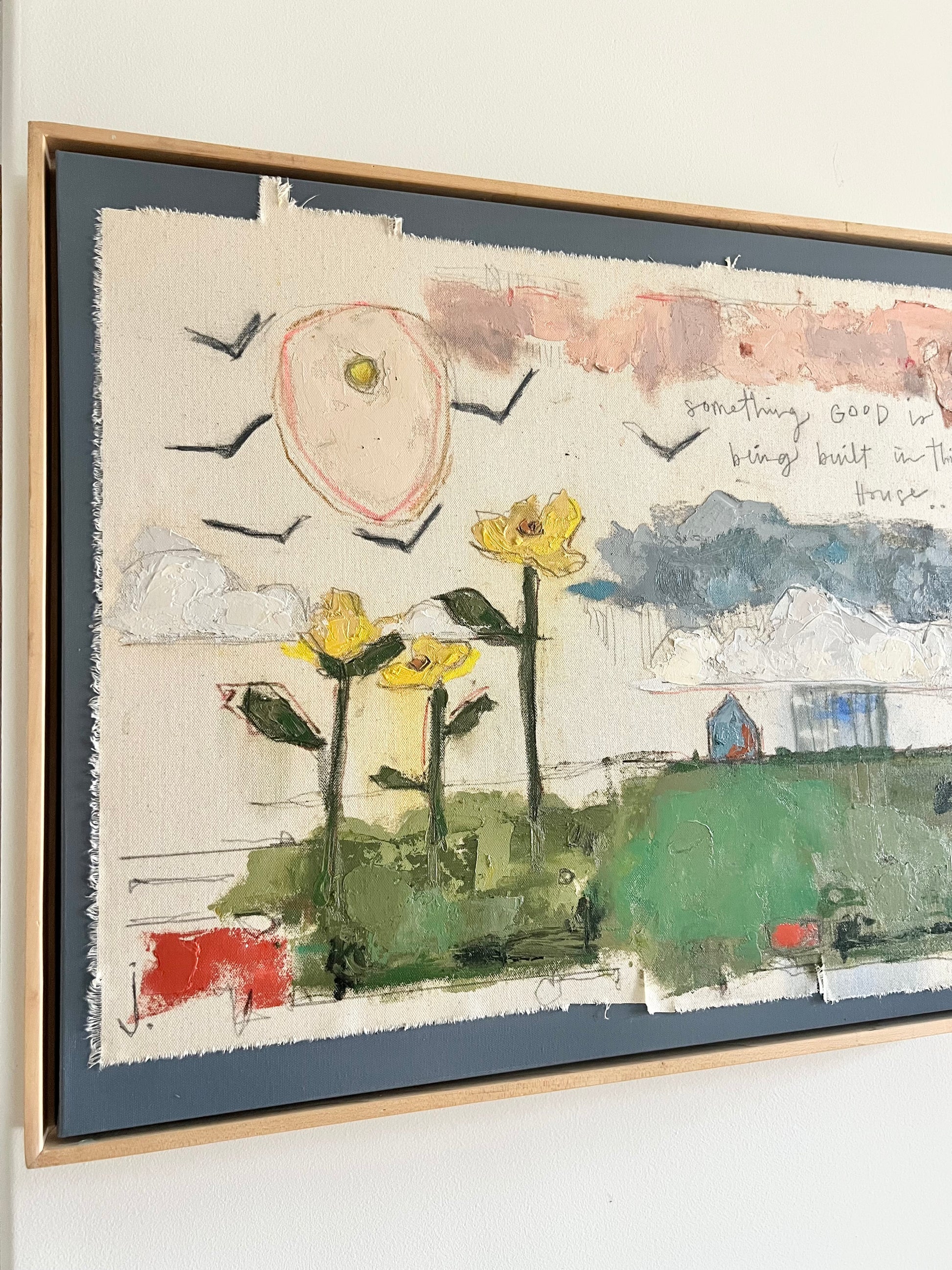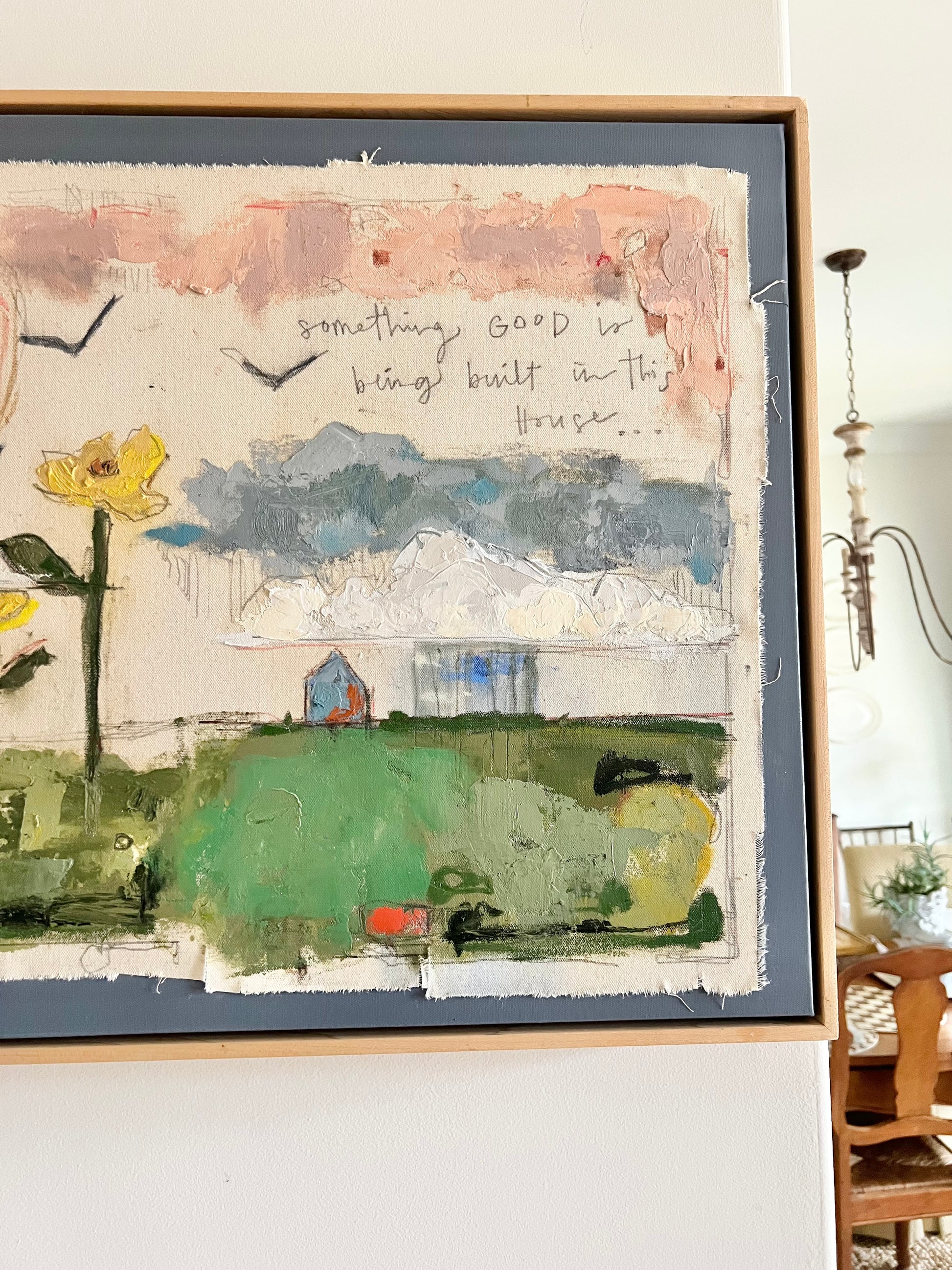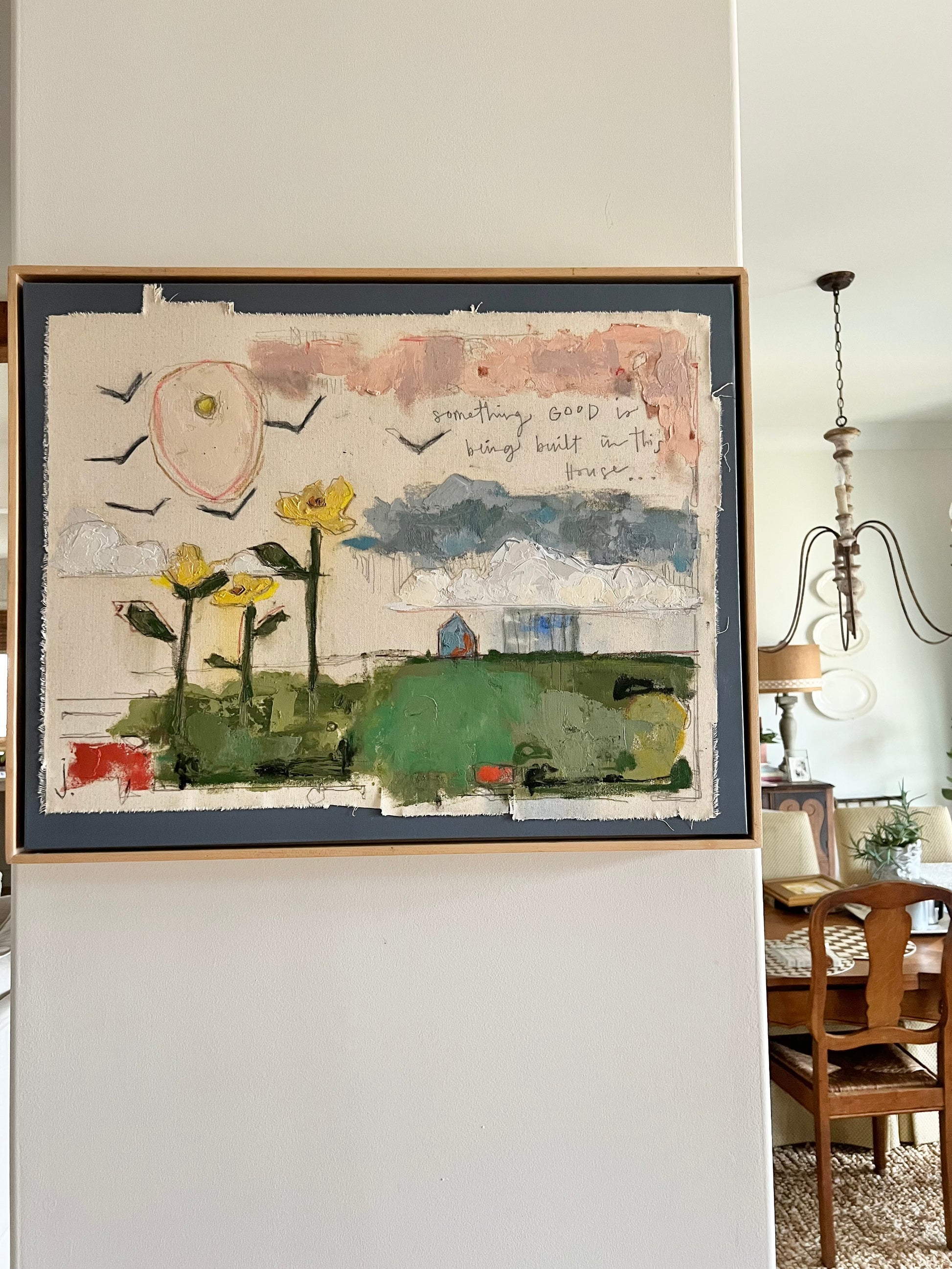 Mixed media oil and pencil sketch on canvas and color block canvas. Let your home tell a story and make it a good one. Canvas measures 22x28 inches and is finished in a floating maple frame.