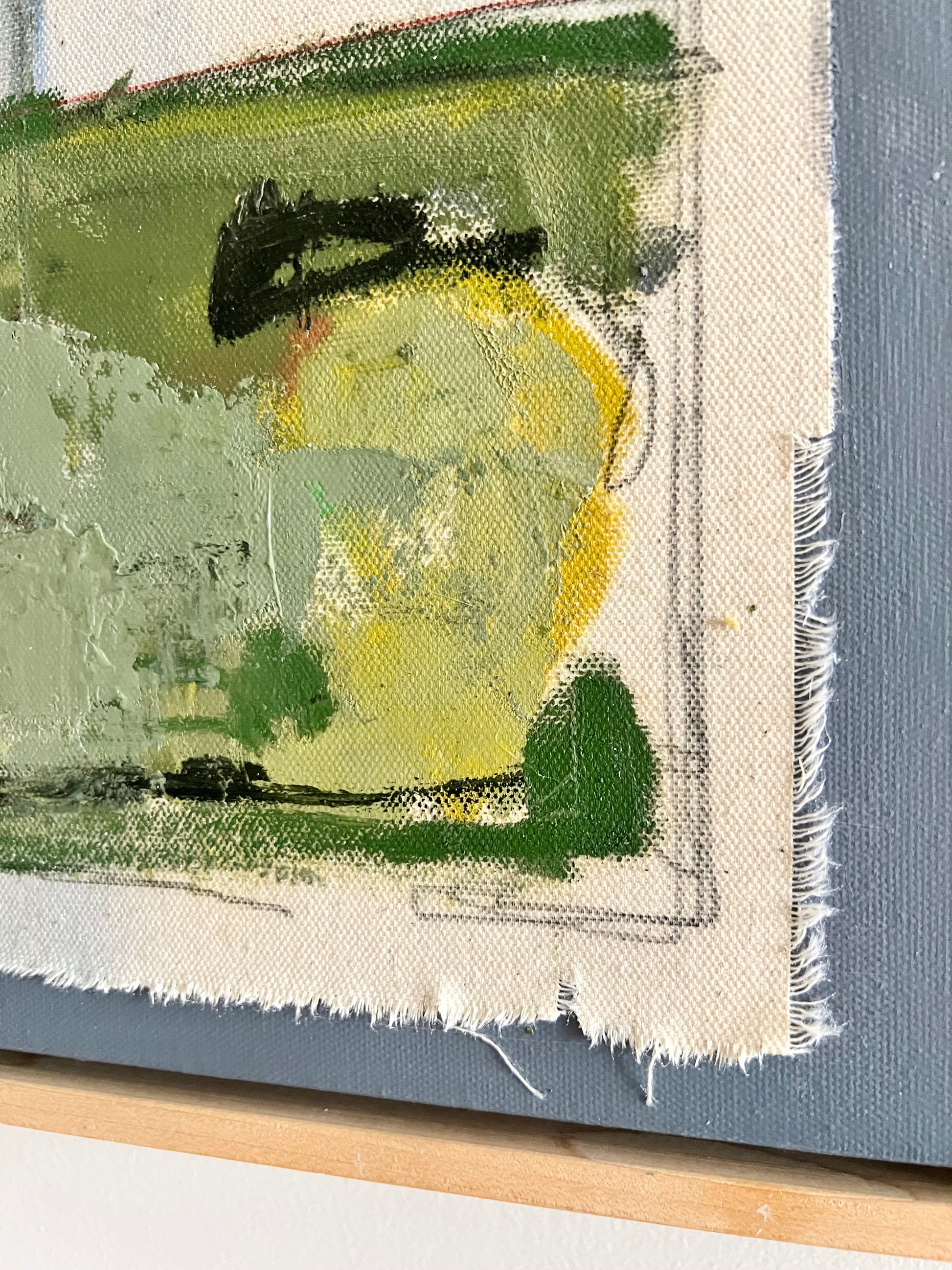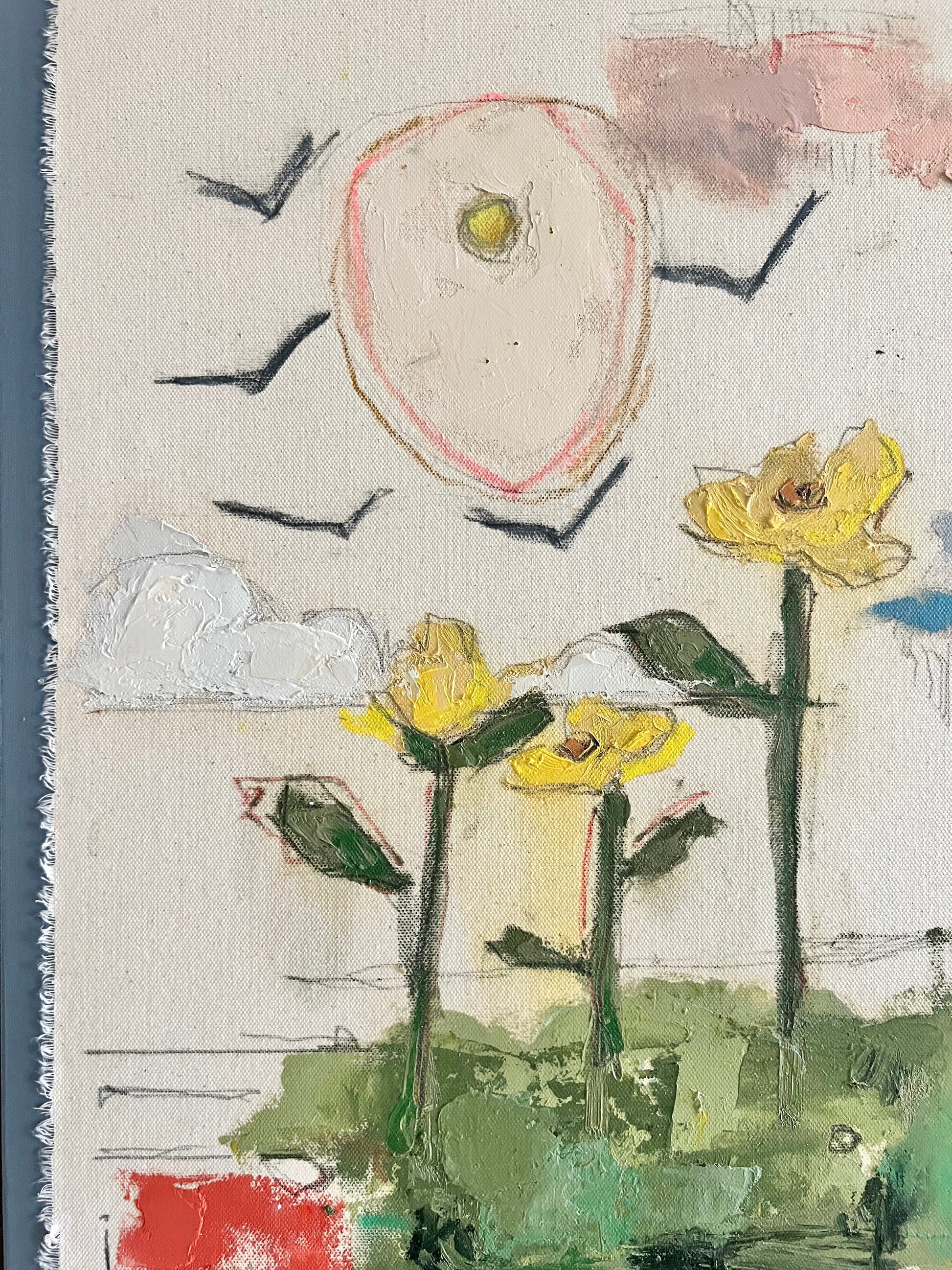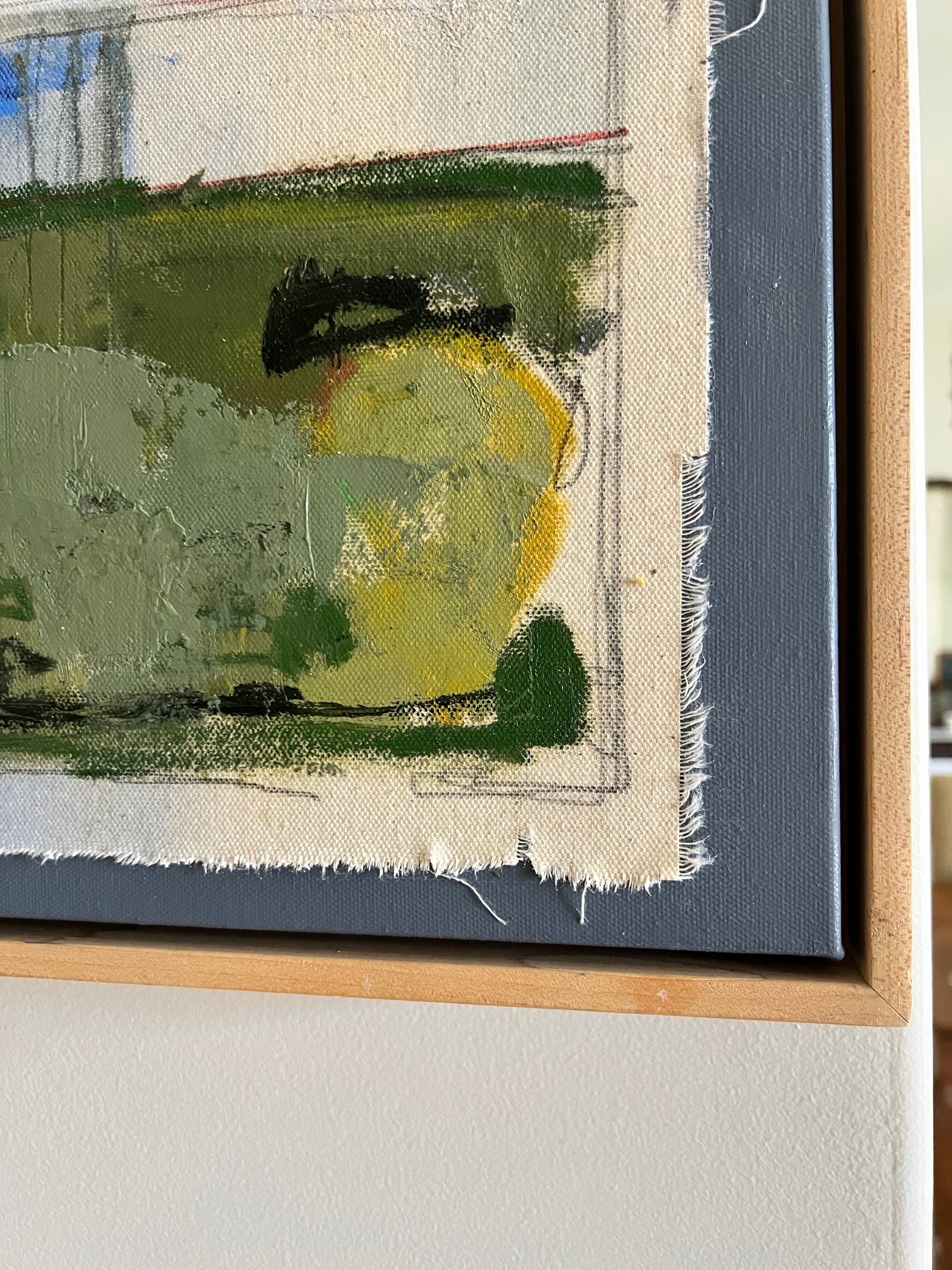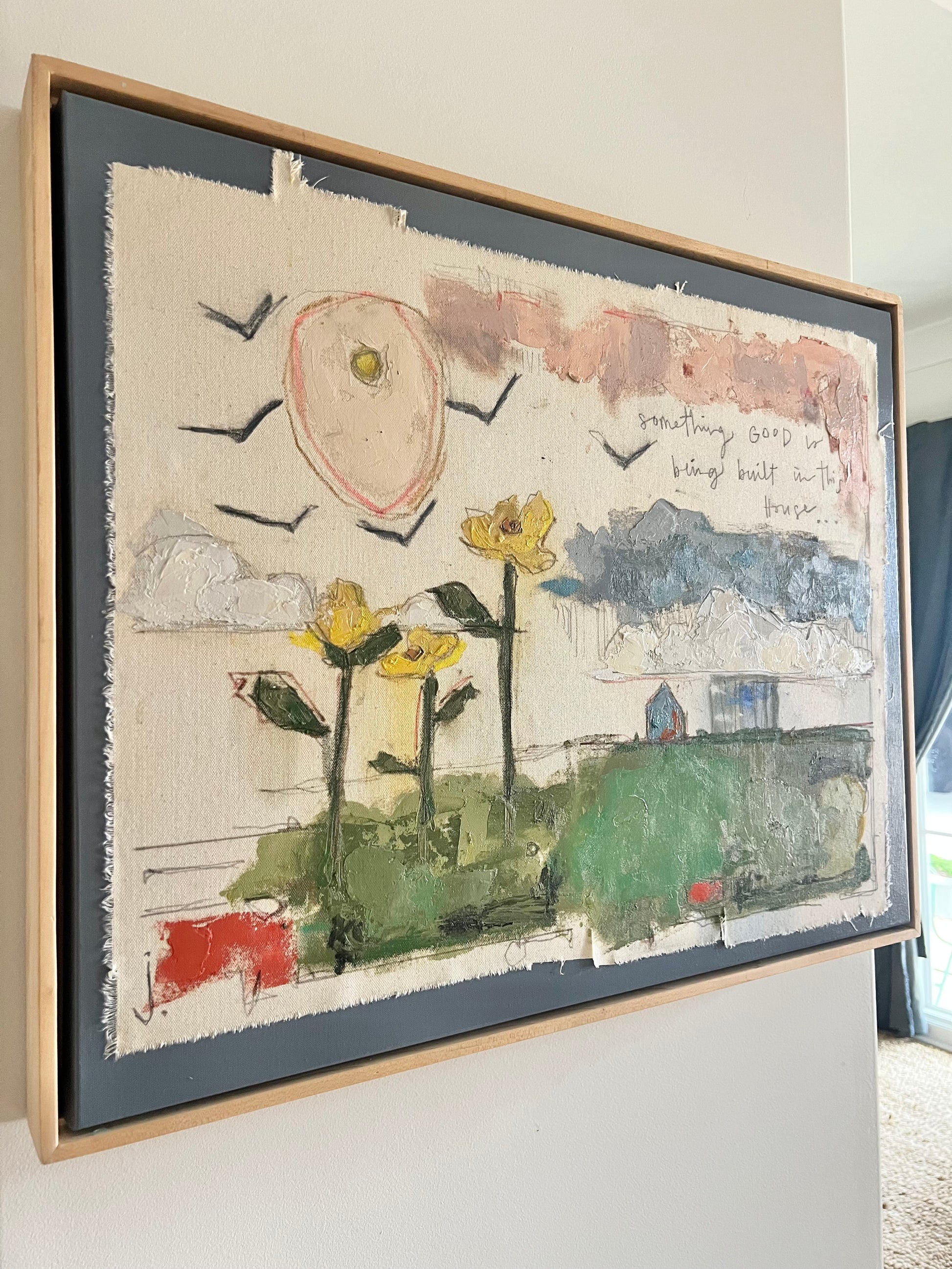 Mixed media oil and pencil sketch on canvas and color block canvas. Let your home tell a story and make it a good one. Canvas measures 22x28 inches and is finished in a floating maple frame.