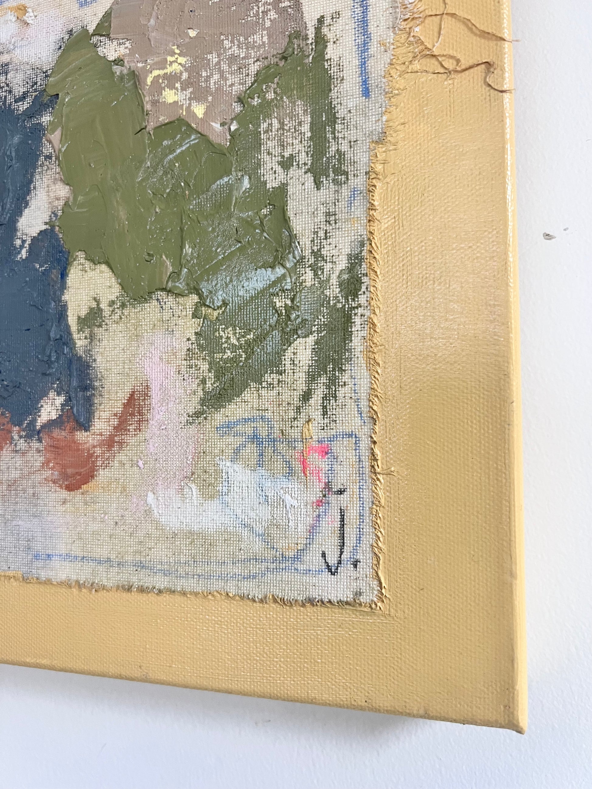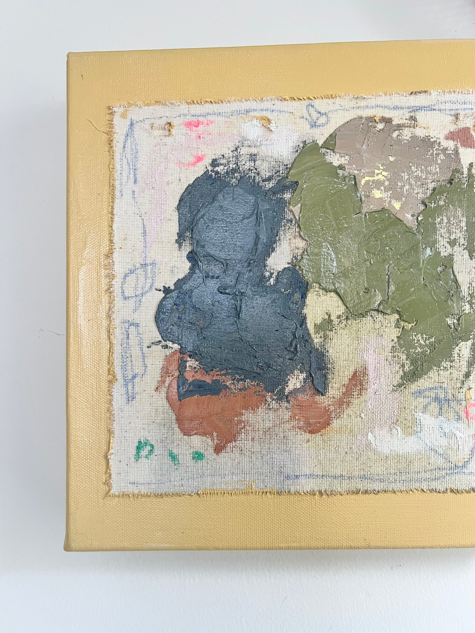 10x10 mixed media oils on canvas mounted to color canvas for color block framing effect. Ready to hang.