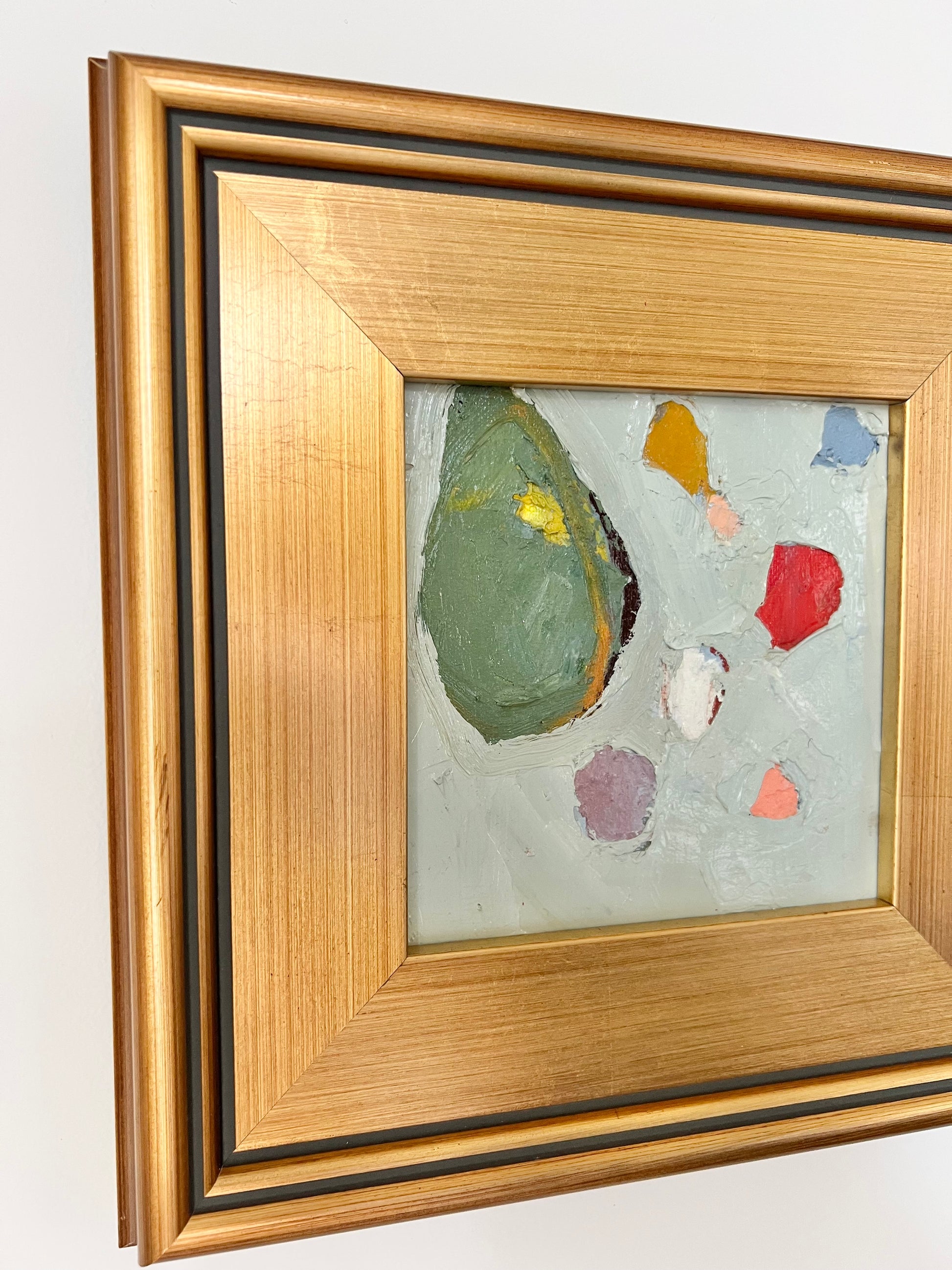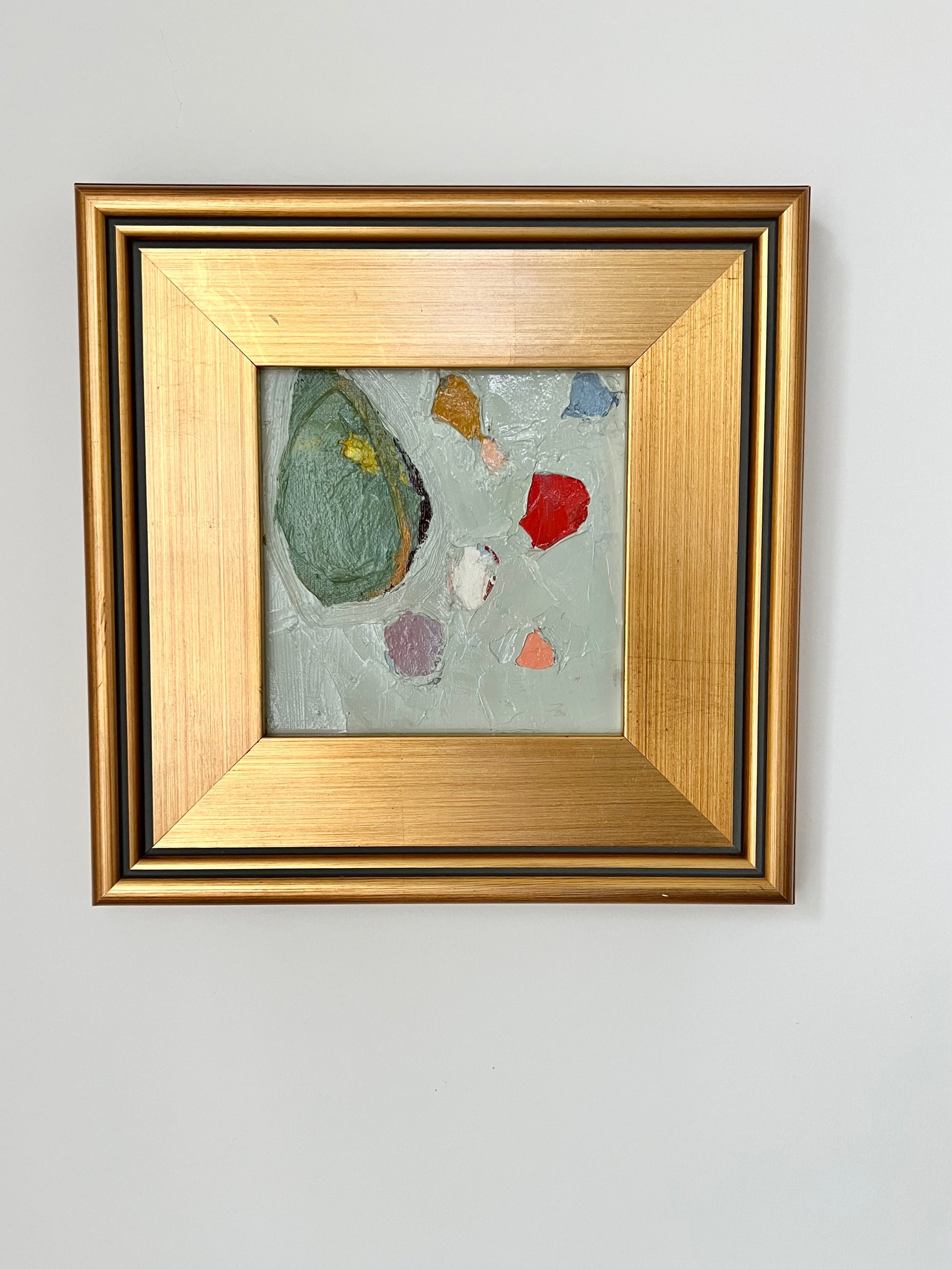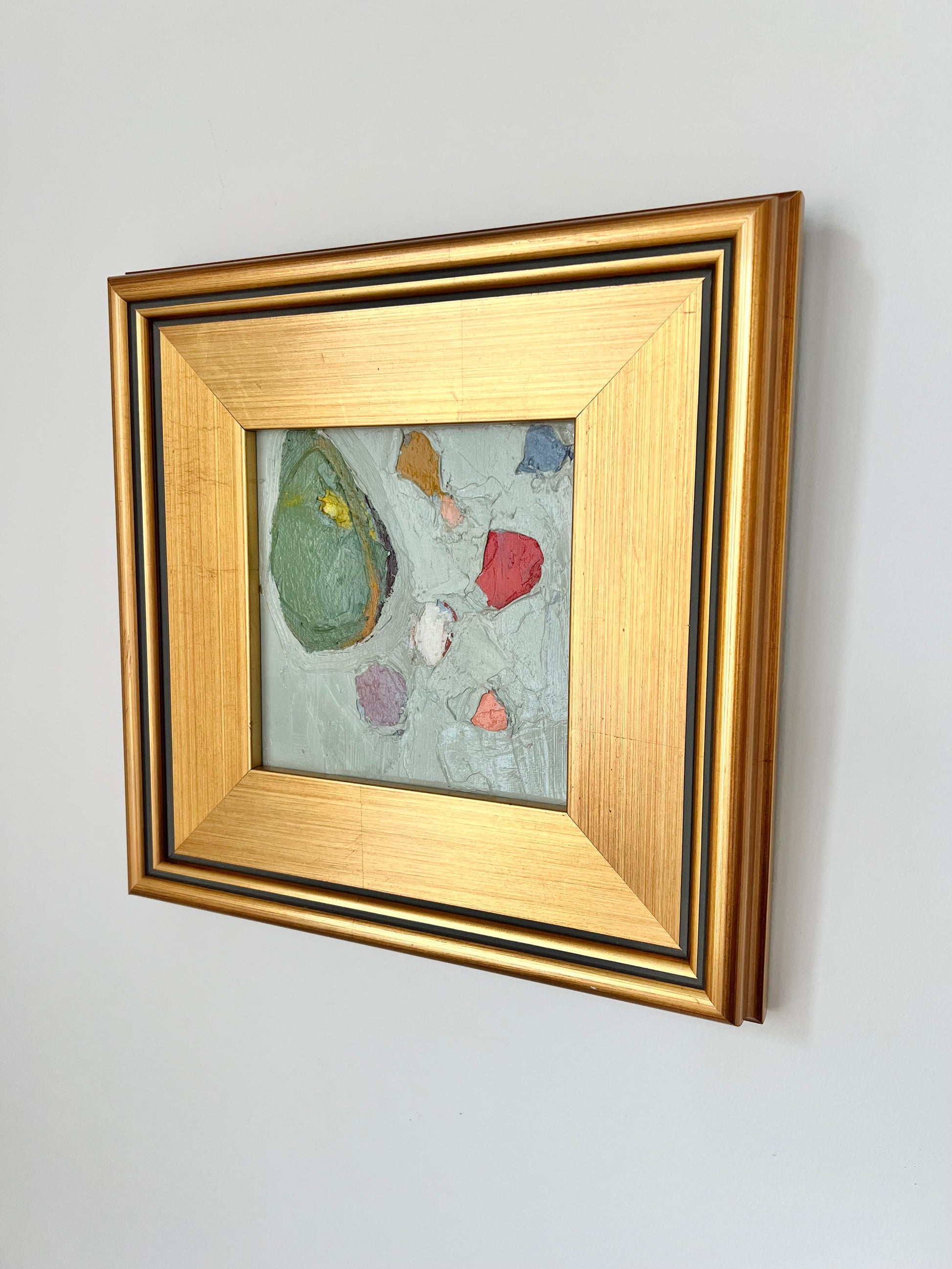 6x6 abstract oil and cold wax painting finished in chunky gold fine art frame.