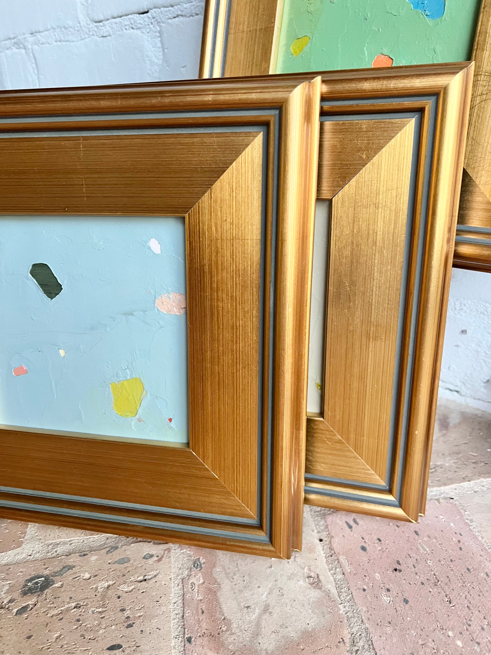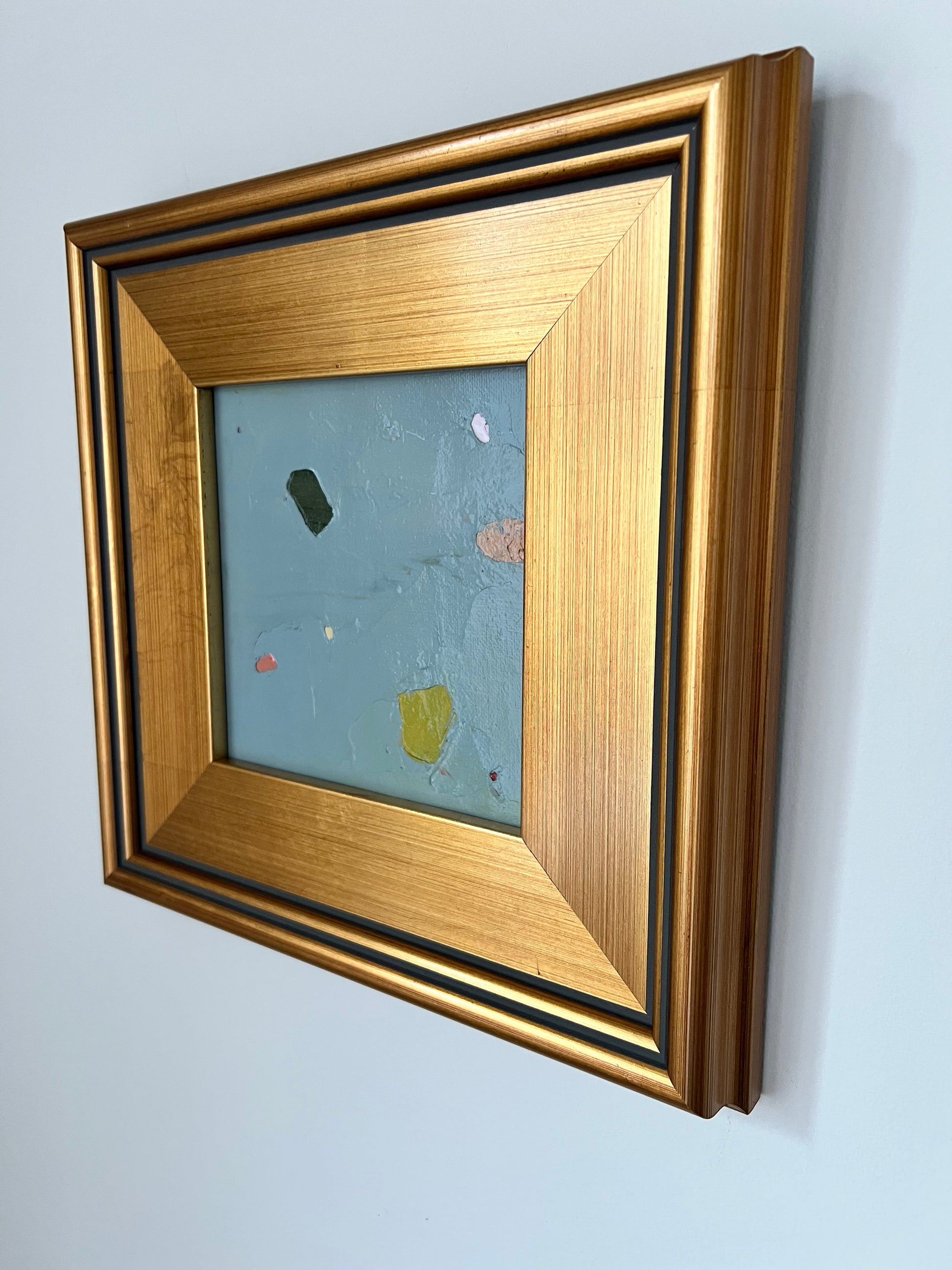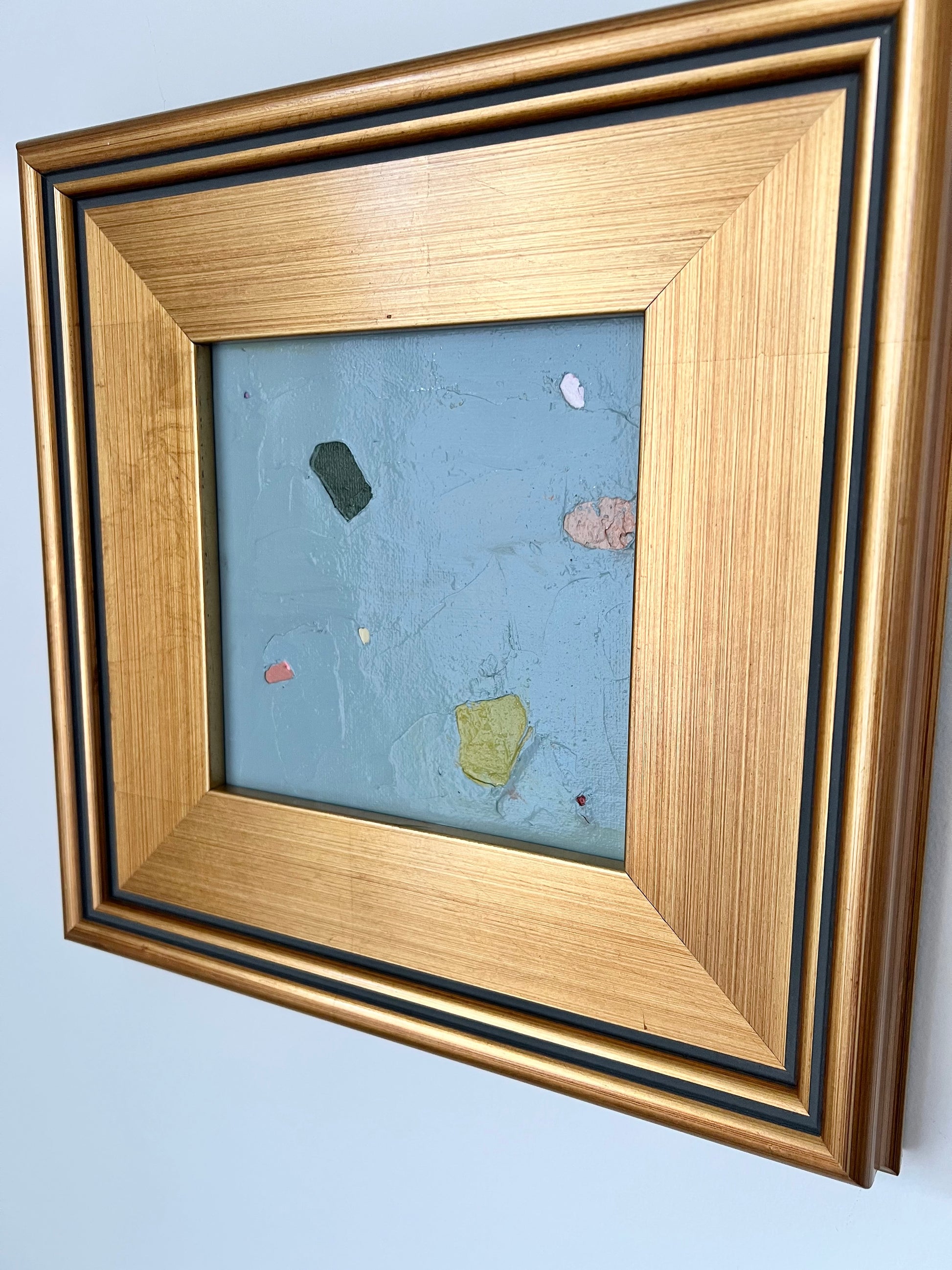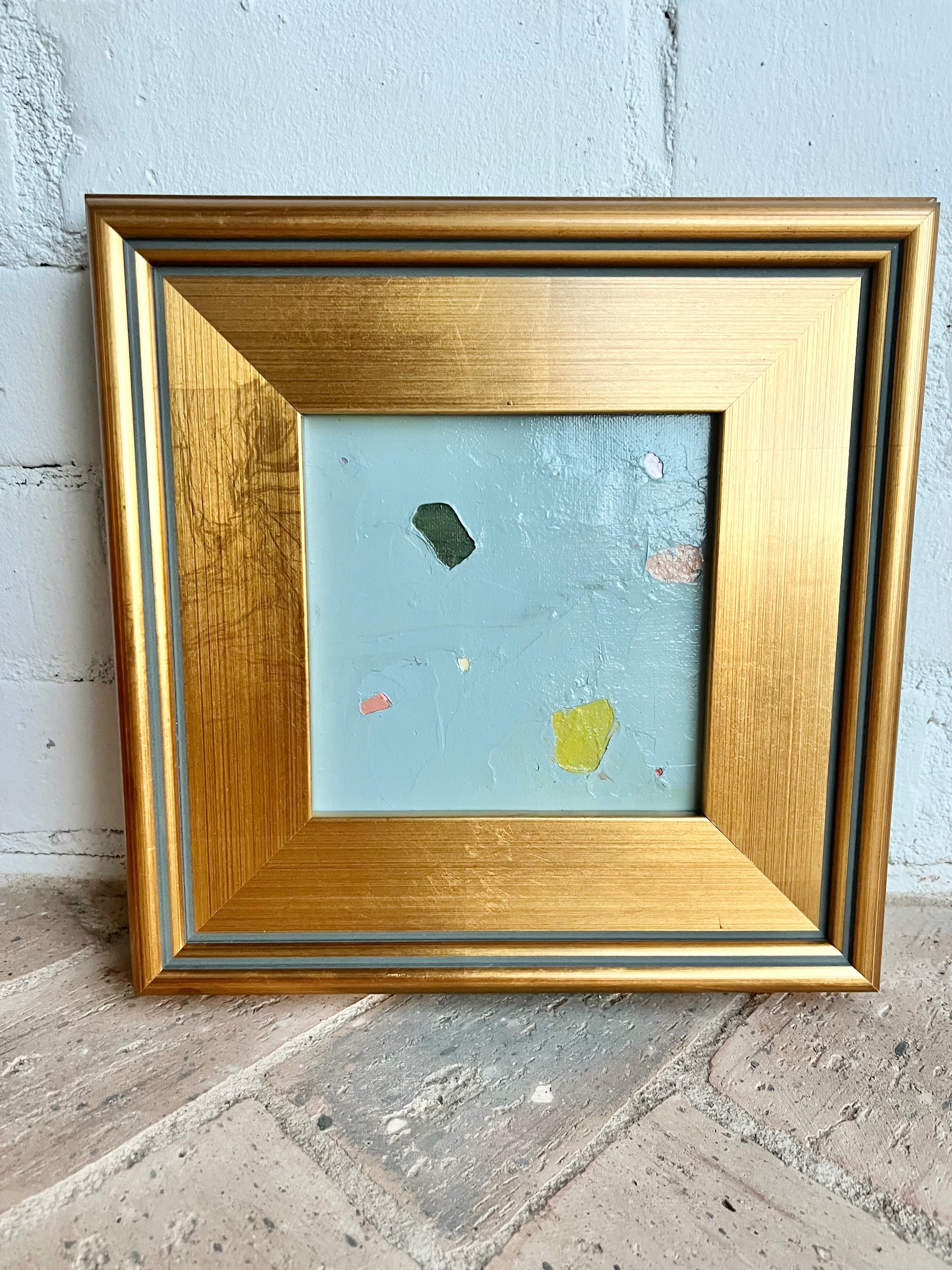 6x6 abstract oil and cold wax painting finished in chunky gold fine art frame.