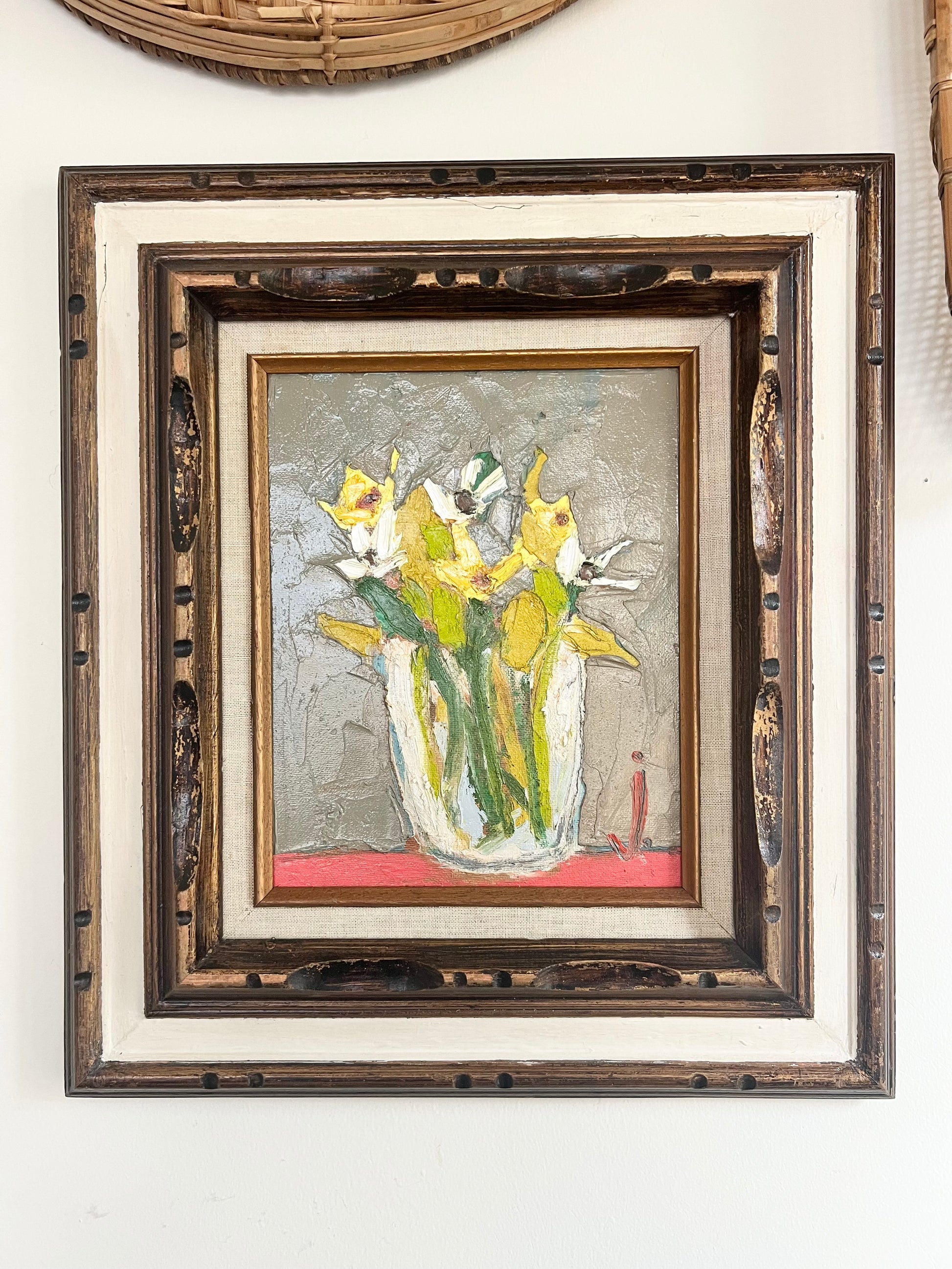 Whimsical oil paint flowers on canvas finished in vintage distressed frame. 8x10 canvas. Frame measures 16x18 inches.